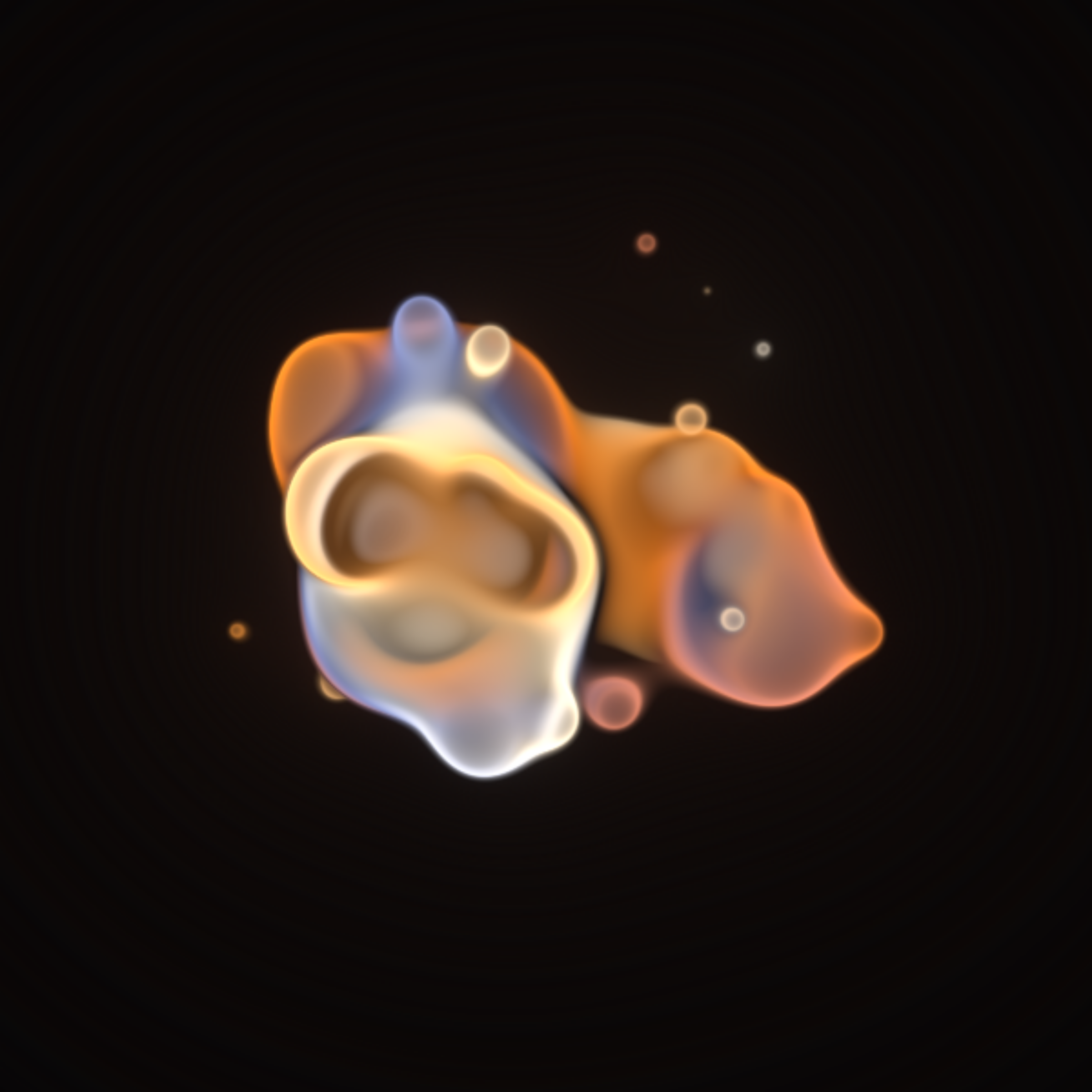 Translucent color bubbles playfully mix and morph to create organic and ephemeral blobby forms. [Shortcuts] spacebar: pause/resume, s: save screenshot, 1→5: high→low resolution. If needed, please adjust resolution or window size for optimal performance.