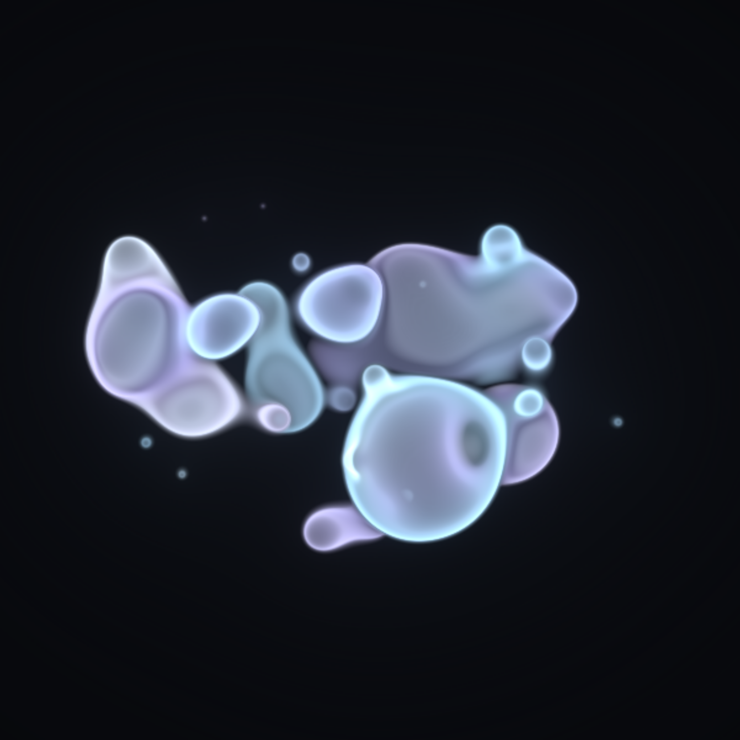 Translucent color bubbles playfully mix and morph to create organic and ephemeral blobby forms. [Shortcuts] spacebar: pause/resume, s: save screenshot, 1→5: high→low resolution. If needed, please adjust resolution or window size for optimal performance.