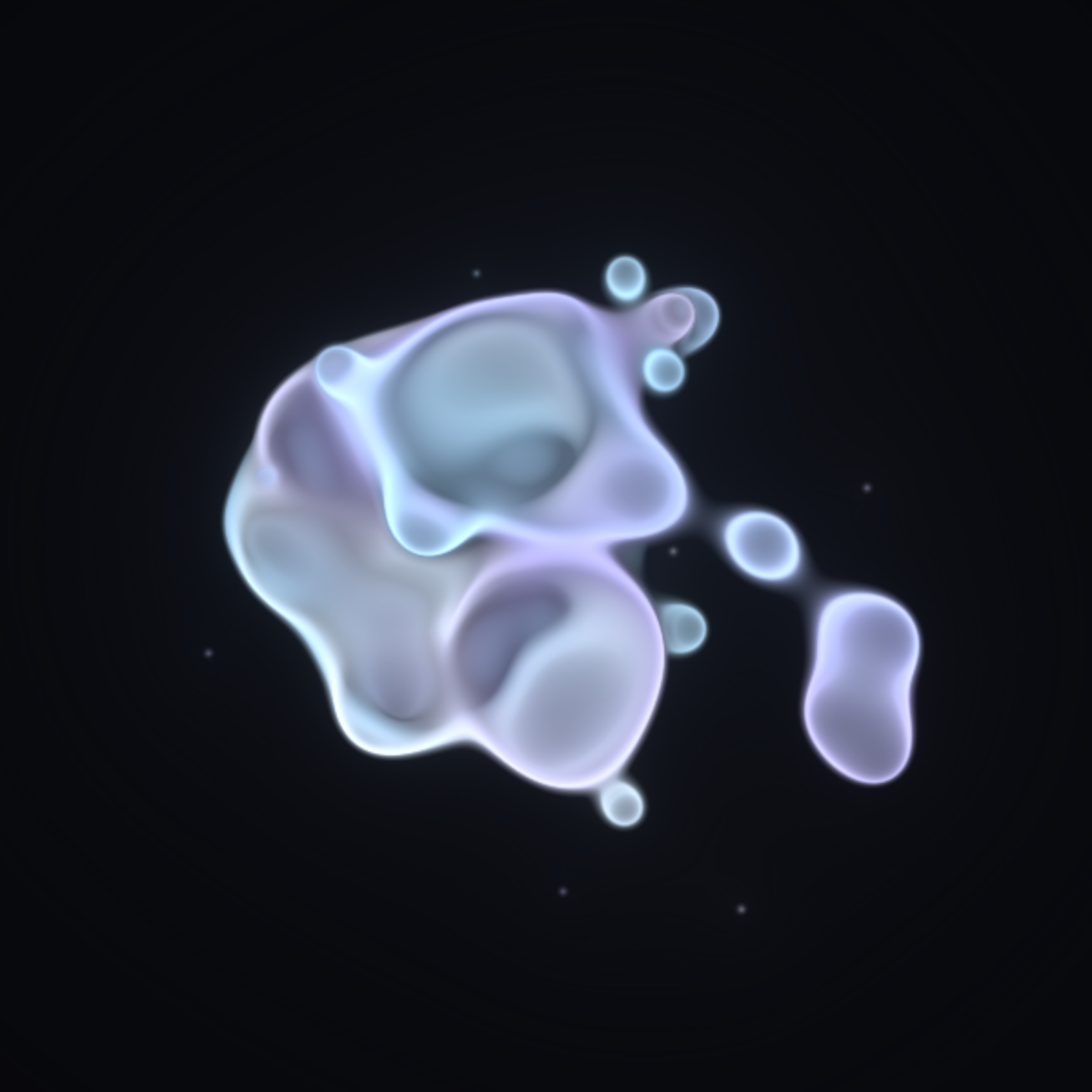 Translucent color bubbles playfully mix and morph to create organic and ephemeral blobby forms. [Shortcuts] spacebar: pause/resume, s: save screenshot, 1→5: high→low resolution. If needed, please adjust resolution or window size for optimal performance.