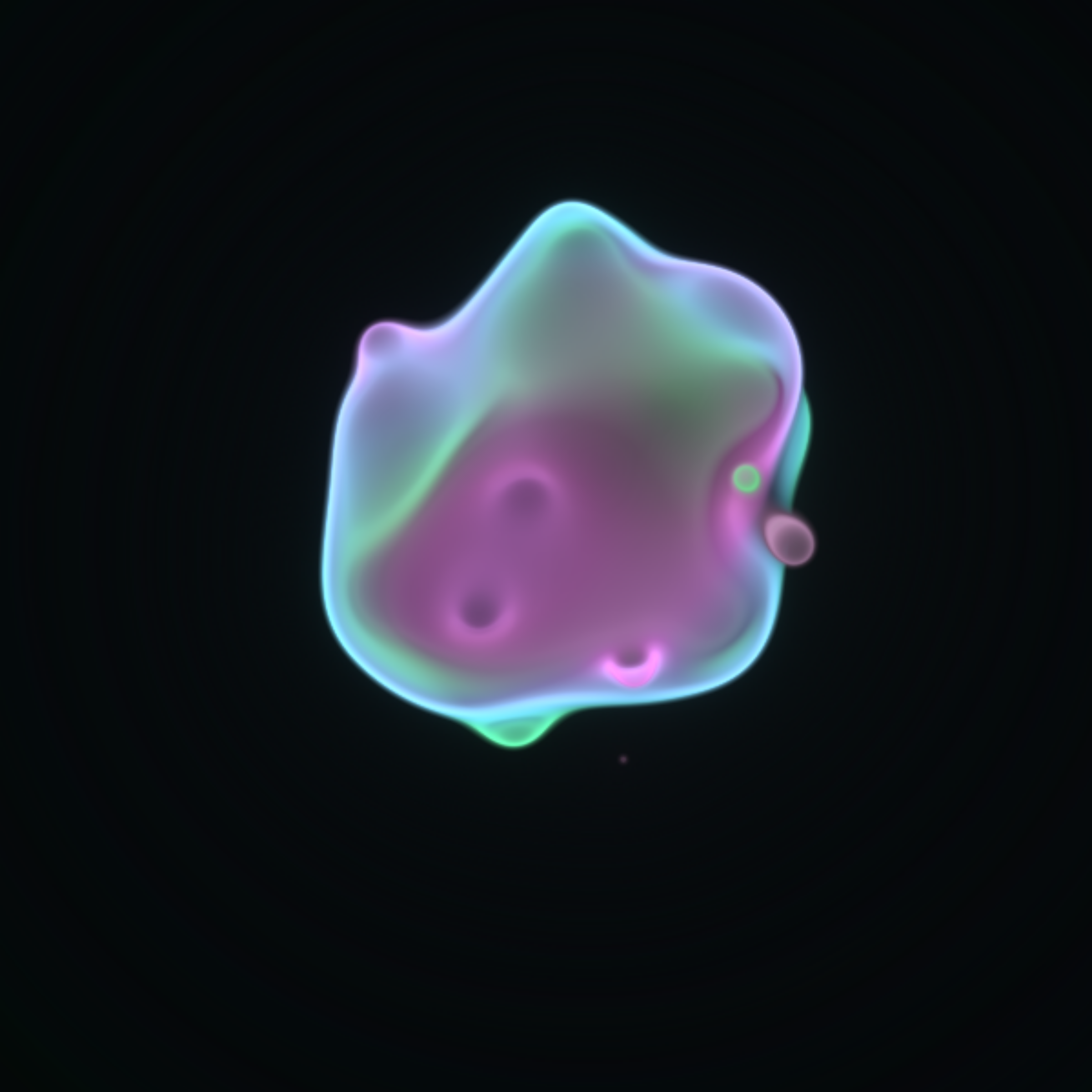 Translucent color bubbles playfully mix and morph to create organic and ephemeral blobby forms. [Shortcuts] spacebar: pause/resume, s: save screenshot, 1→5: high→low resolution. If needed, please adjust resolution or window size for optimal performance.
