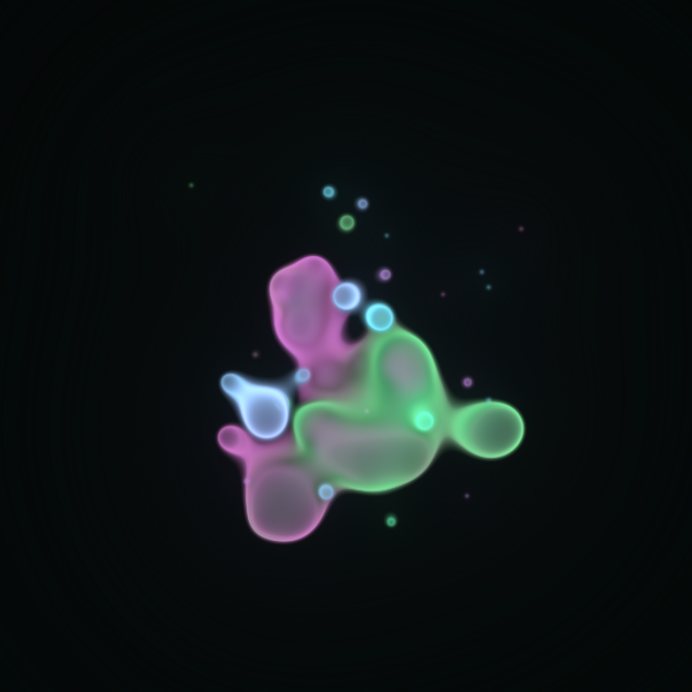 Translucent color bubbles playfully mix and morph to create organic and ephemeral blobby forms. [Shortcuts] spacebar: pause/resume, s: save screenshot, 1→5: high→low resolution. If needed, please adjust resolution or window size for optimal performance.