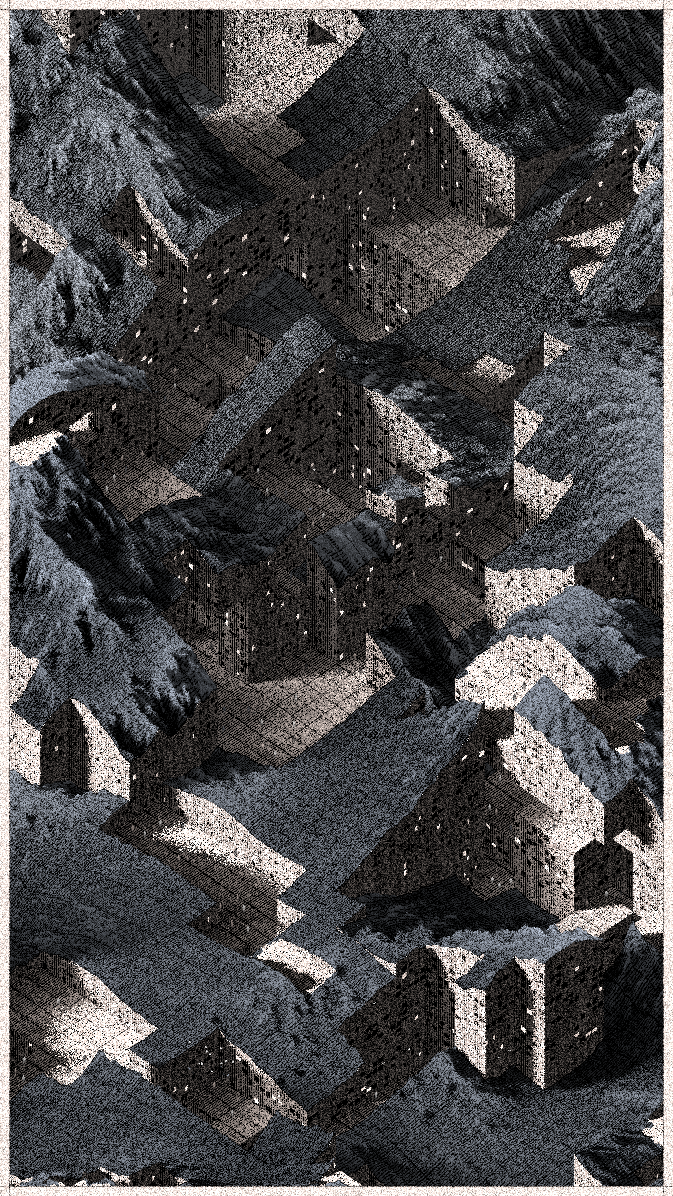 Cantera is a project that brings these stories to a non-physical, generative space. It replaces atoms of stone and soil with digital bits. It draws landscapes inspired by the imagery of Basque stone quarries and iron mines and writes narratives about non-existent habitats where the boundaries between extraction, shelter, and natural forms become indistinct.
