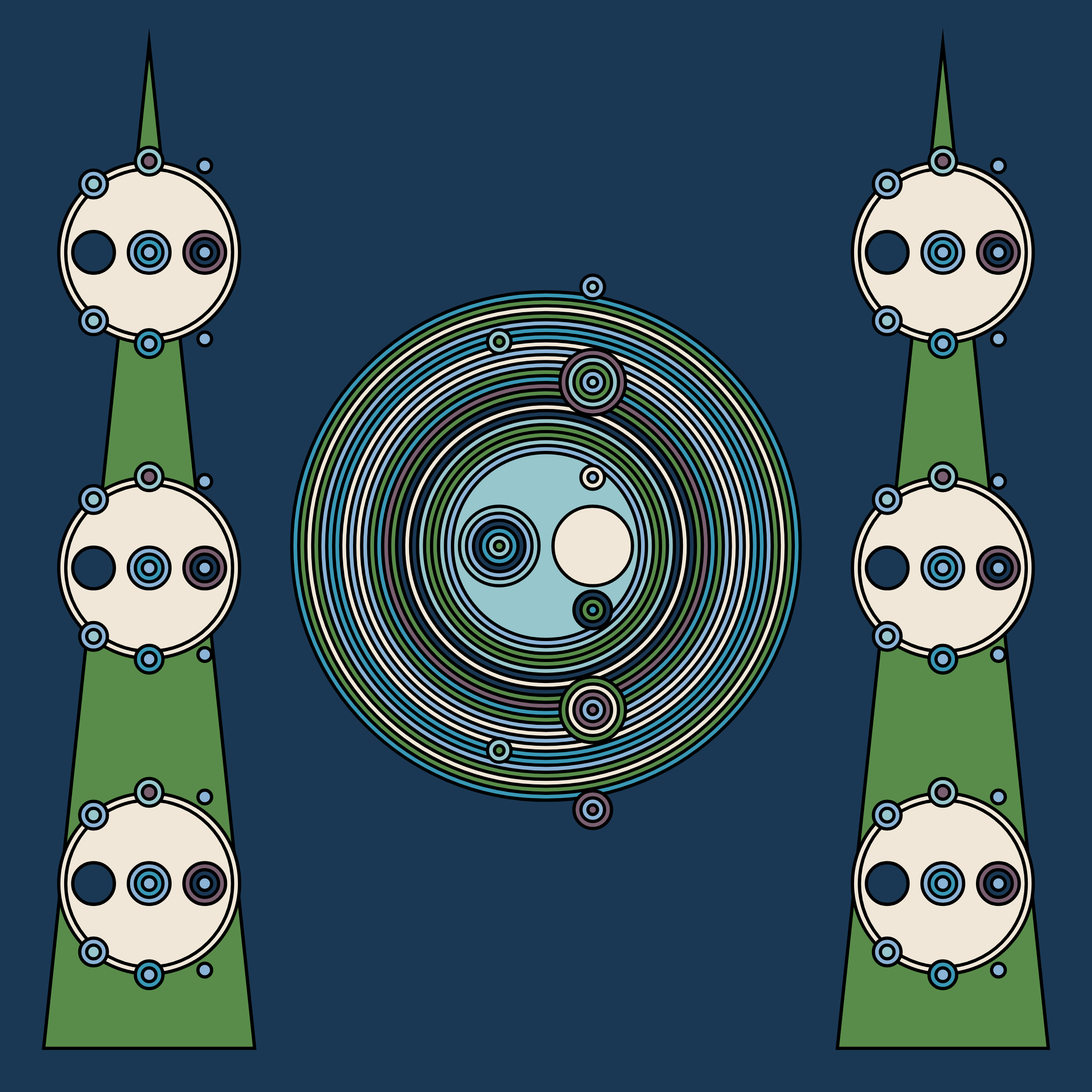 A study in composition using simple shapes and layout rules. When repetitive patterns fail, and the symmetry isn't quite right, the images are strangely evocative. Somewhere between art deco, pop art, and sci-fi.