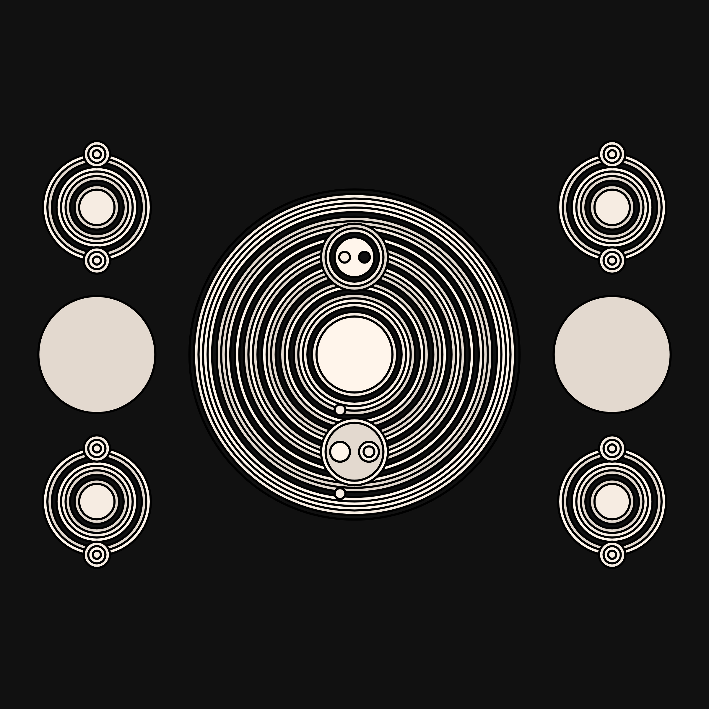 A study in composition using simple shapes and layout rules. When repetitive patterns fail, and the symmetry isn't quite right, the images are strangely evocative. Somewhere between art deco, pop art, and sci-fi.