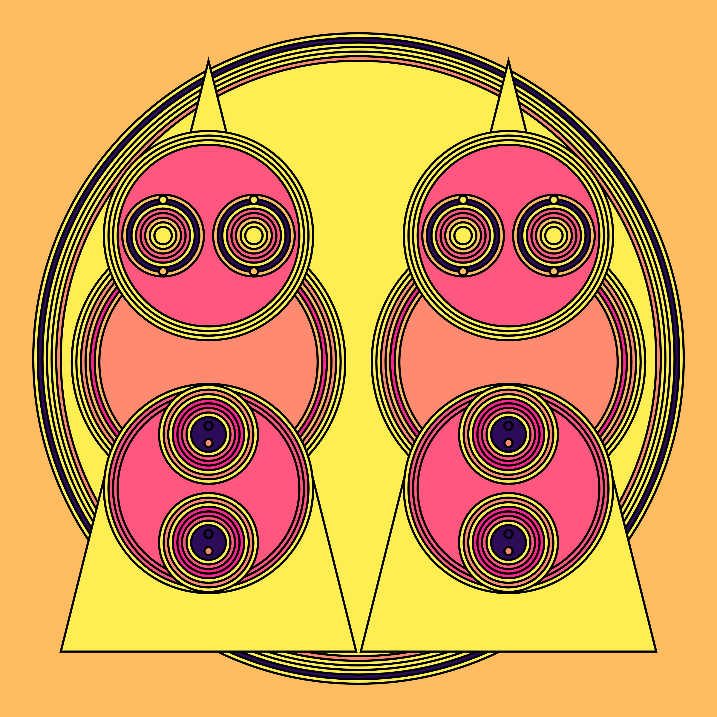A study in composition using simple shapes and layout rules. When repetitive patterns fail, and the symmetry isn't quite right, the images are strangely evocative. Somewhere between art deco, pop art, and sci-fi.