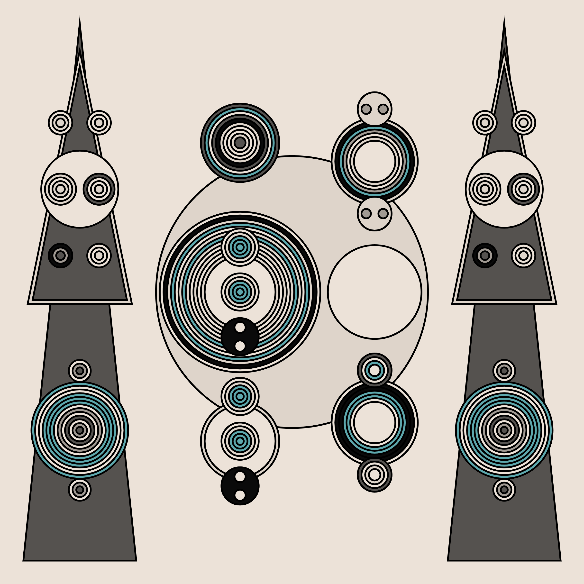 A study in composition using simple shapes and layout rules. When repetitive patterns fail, and the symmetry isn't quite right, the images are strangely evocative. Somewhere between art deco, pop art, and sci-fi.