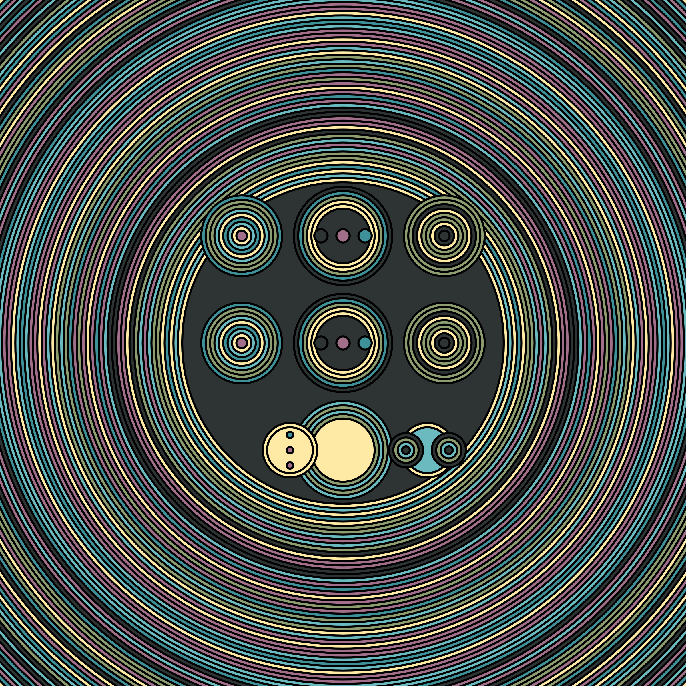 A study in composition using simple shapes and layout rules. When repetitive patterns fail, and the symmetry isn't quite right, the images are strangely evocative. Somewhere between art deco, pop art, and sci-fi.