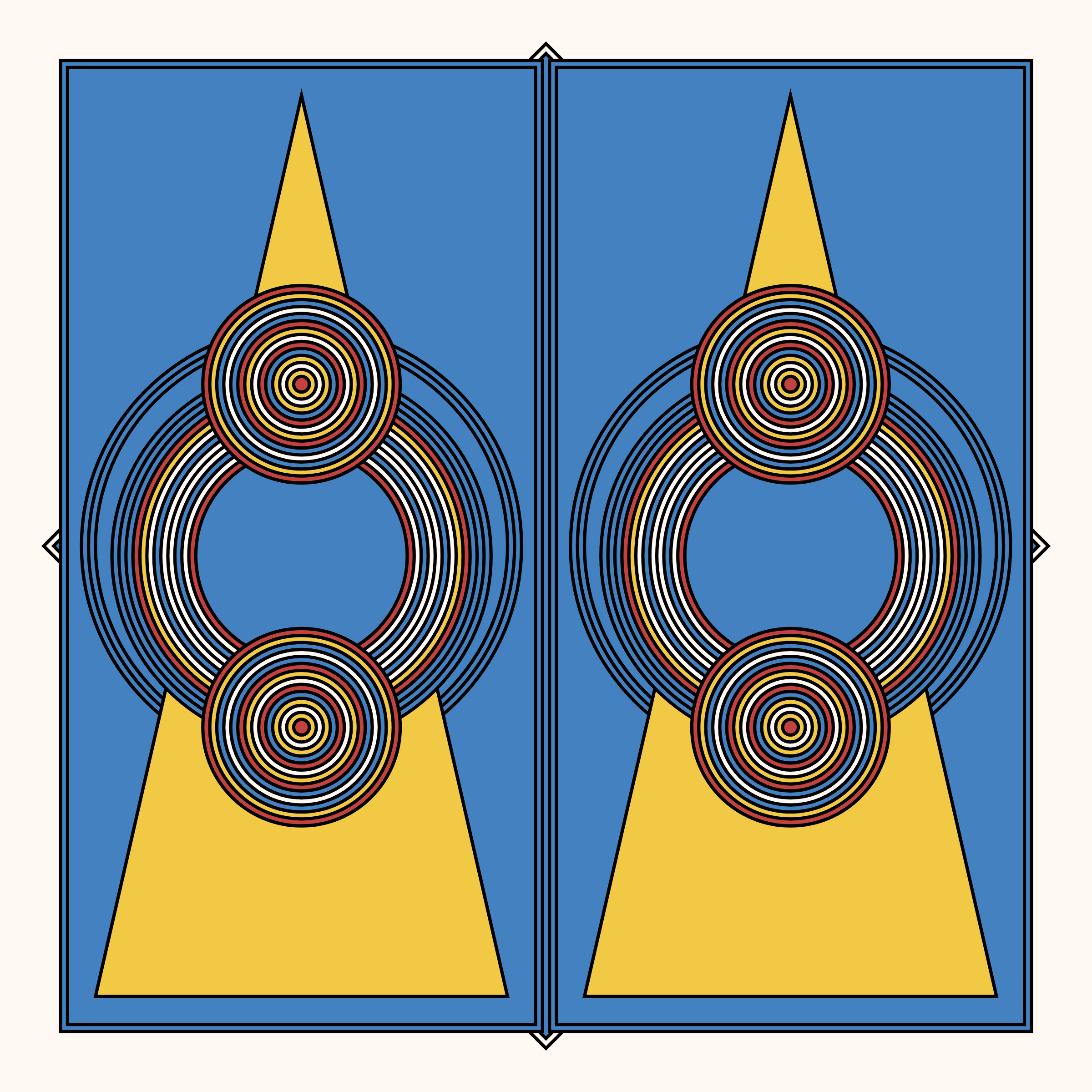 A study in composition using simple shapes and layout rules. When repetitive patterns fail, and the symmetry isn't quite right, the images are strangely evocative. Somewhere between art deco, pop art, and sci-fi.