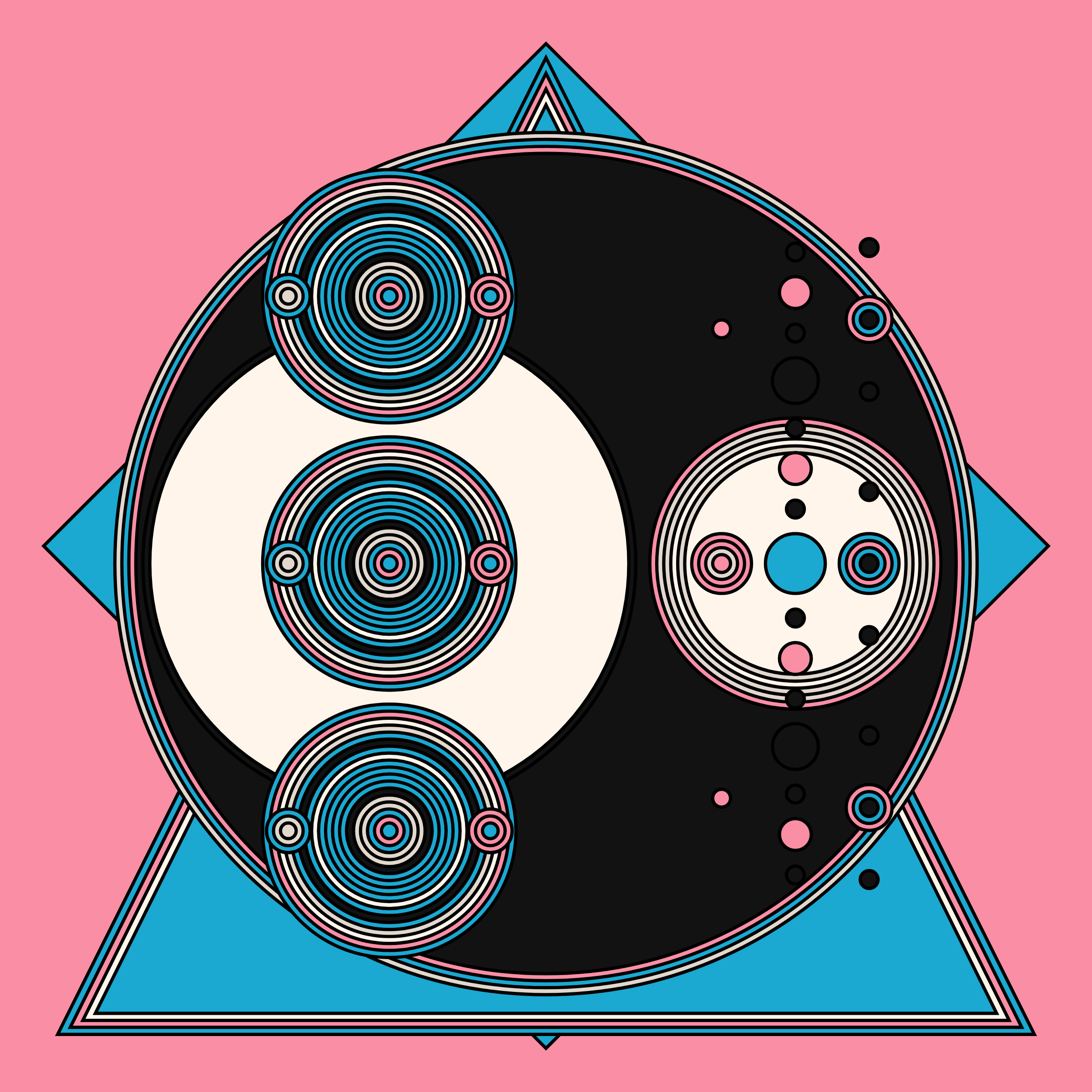 A study in composition using simple shapes and layout rules. When repetitive patterns fail, and the symmetry isn't quite right, the images are strangely evocative. Somewhere between art deco, pop art, and sci-fi.