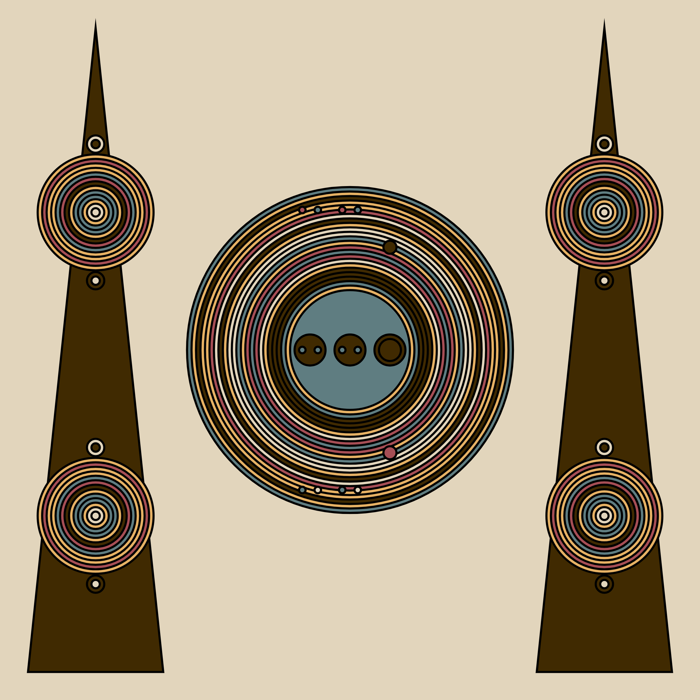 A study in composition using simple shapes and layout rules. When repetitive patterns fail, and the symmetry isn't quite right, the images are strangely evocative. Somewhere between art deco, pop art, and sci-fi.