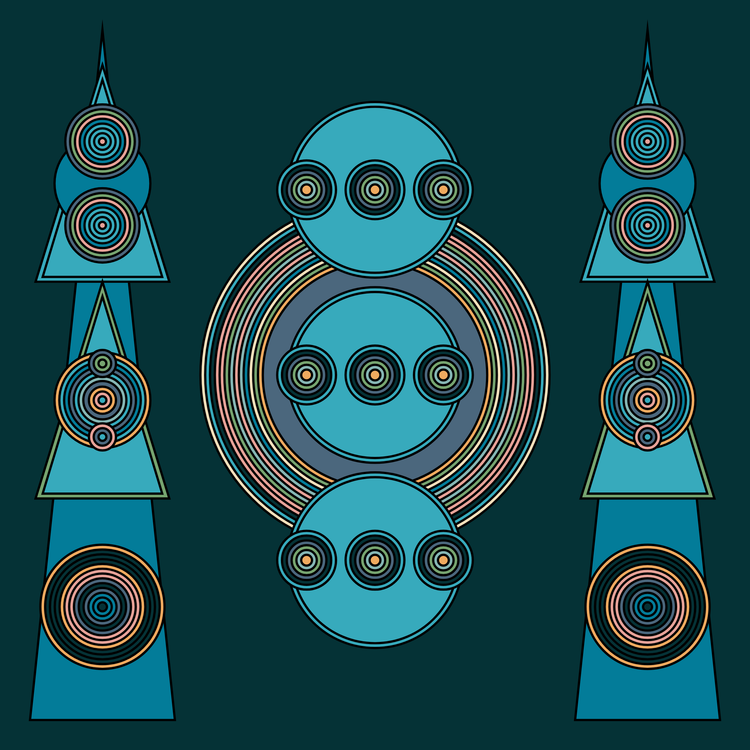 A study in composition using simple shapes and layout rules. When repetitive patterns fail, and the symmetry isn't quite right, the images are strangely evocative. Somewhere between art deco, pop art, and sci-fi.