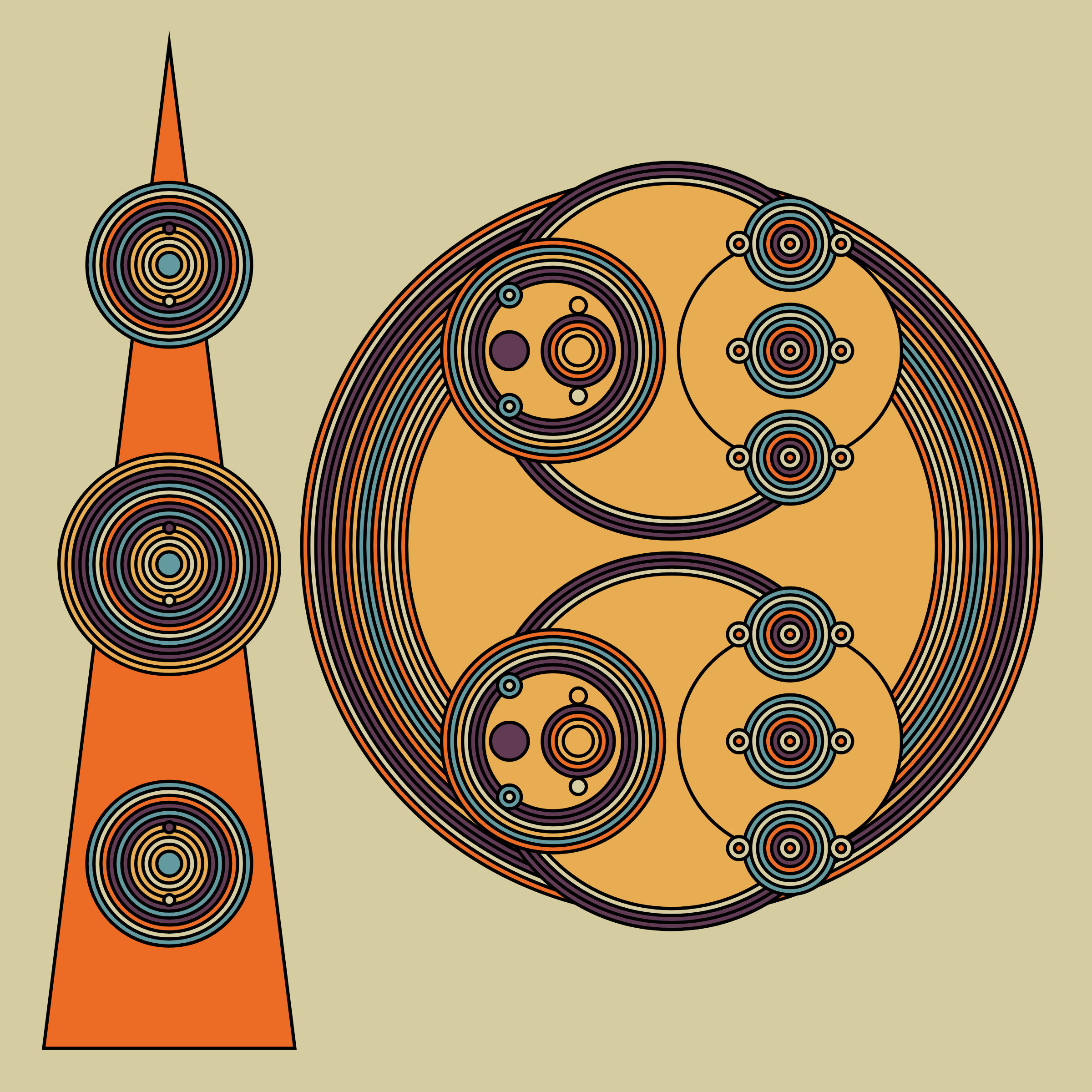 A study in composition using simple shapes and layout rules. When repetitive patterns fail, and the symmetry isn't quite right, the images are strangely evocative. Somewhere between art deco, pop art, and sci-fi.