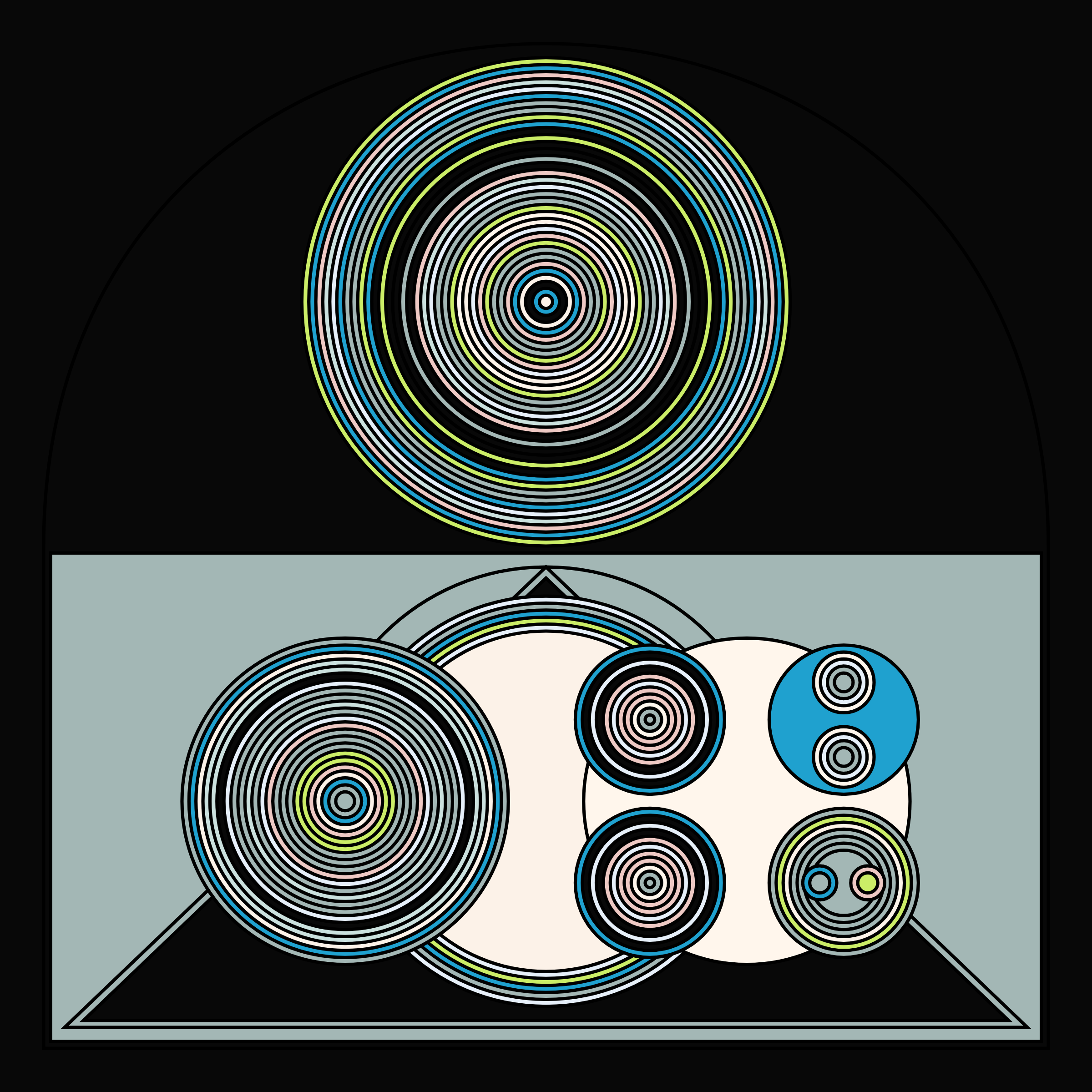 A study in composition using simple shapes and layout rules. When repetitive patterns fail, and the symmetry isn't quite right, the images are strangely evocative. Somewhere between art deco, pop art, and sci-fi.