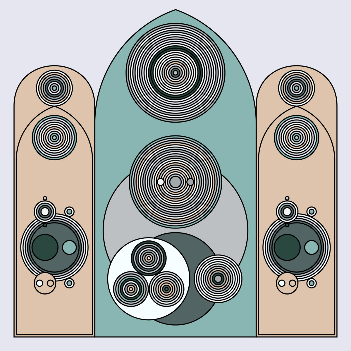 A study in composition using simple shapes and layout rules. When repetitive patterns fail, and the symmetry isn't quite right, the images are strangely evocative. Somewhere between art deco, pop art, and sci-fi.