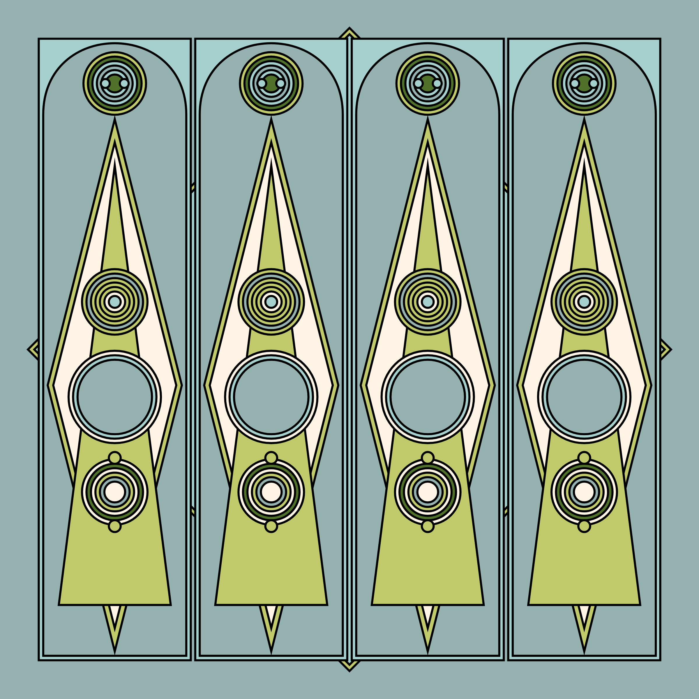 A study in composition using simple shapes and layout rules. When repetitive patterns fail, and the symmetry isn't quite right, the images are strangely evocative. Somewhere between art deco, pop art, and sci-fi.