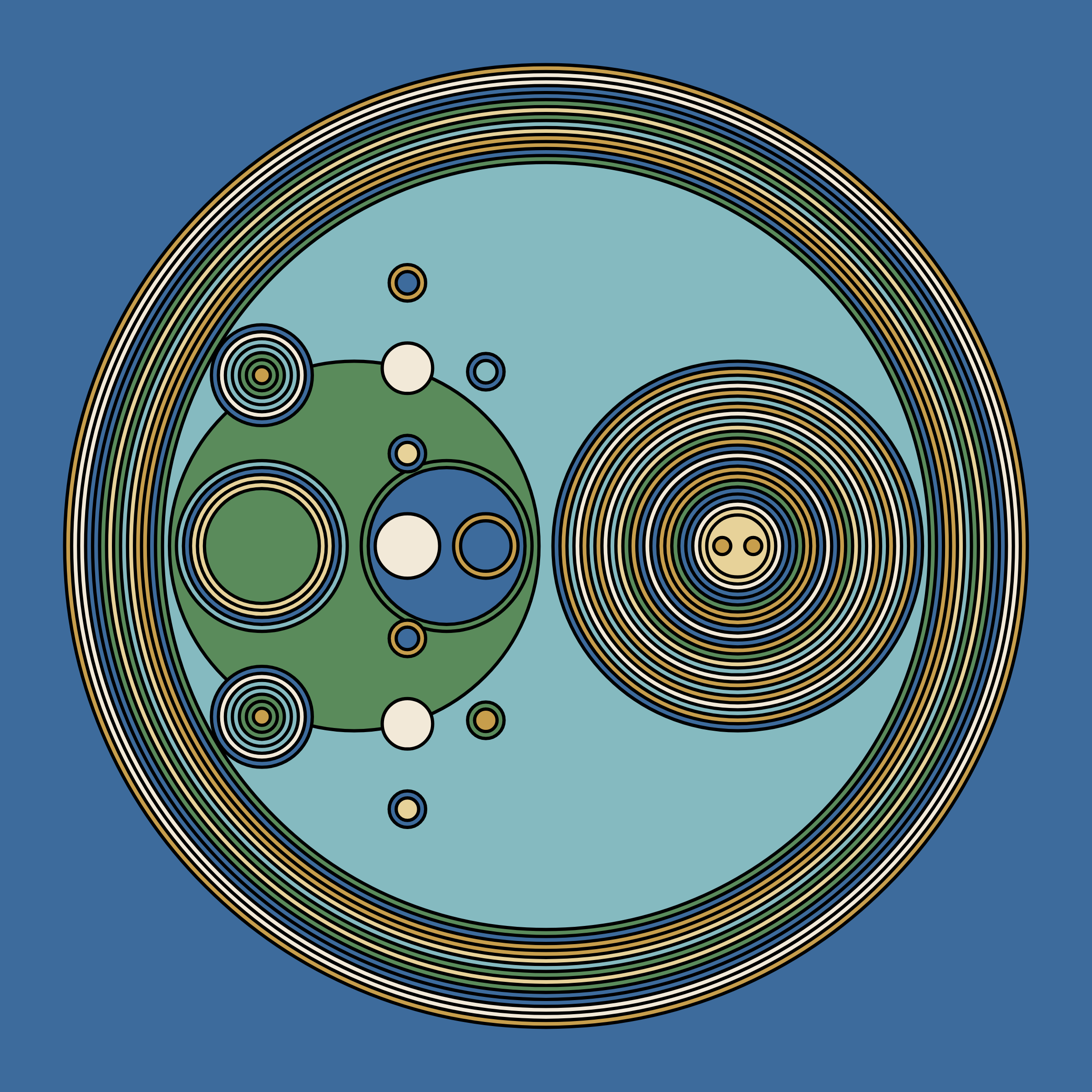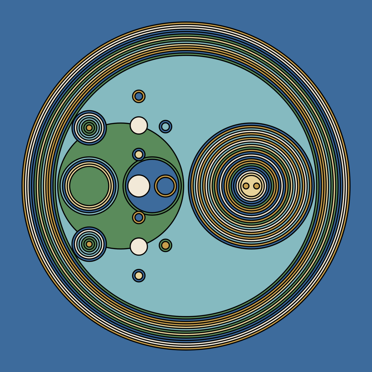 A study in composition using simple shapes and layout rules. When repetitive patterns fail, and the symmetry isn't quite right, the images are strangely evocative. Somewhere between art deco, pop art, and sci-fi.