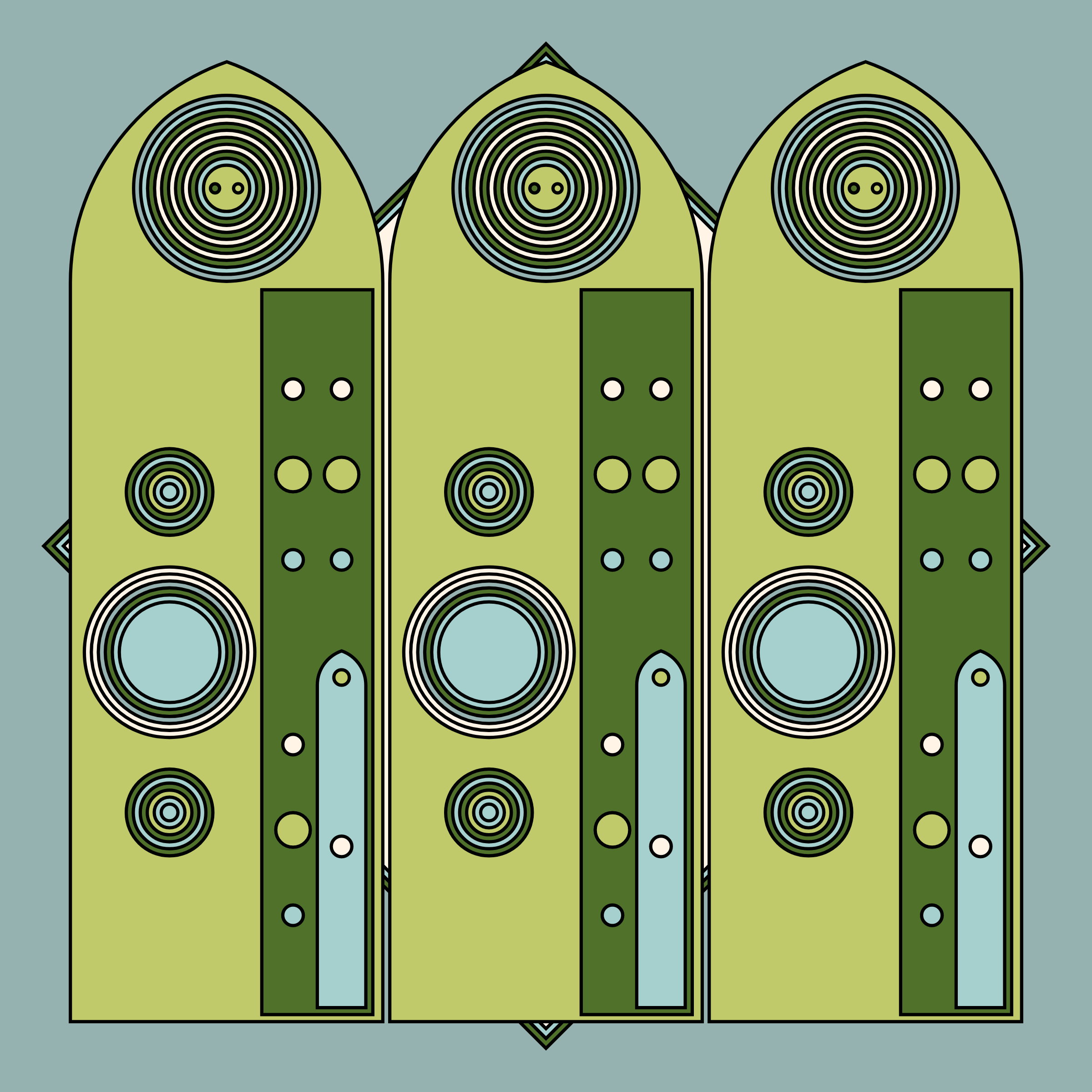 A study in composition using simple shapes and layout rules. When repetitive patterns fail, and the symmetry isn't quite right, the images are strangely evocative. Somewhere between art deco, pop art, and sci-fi.