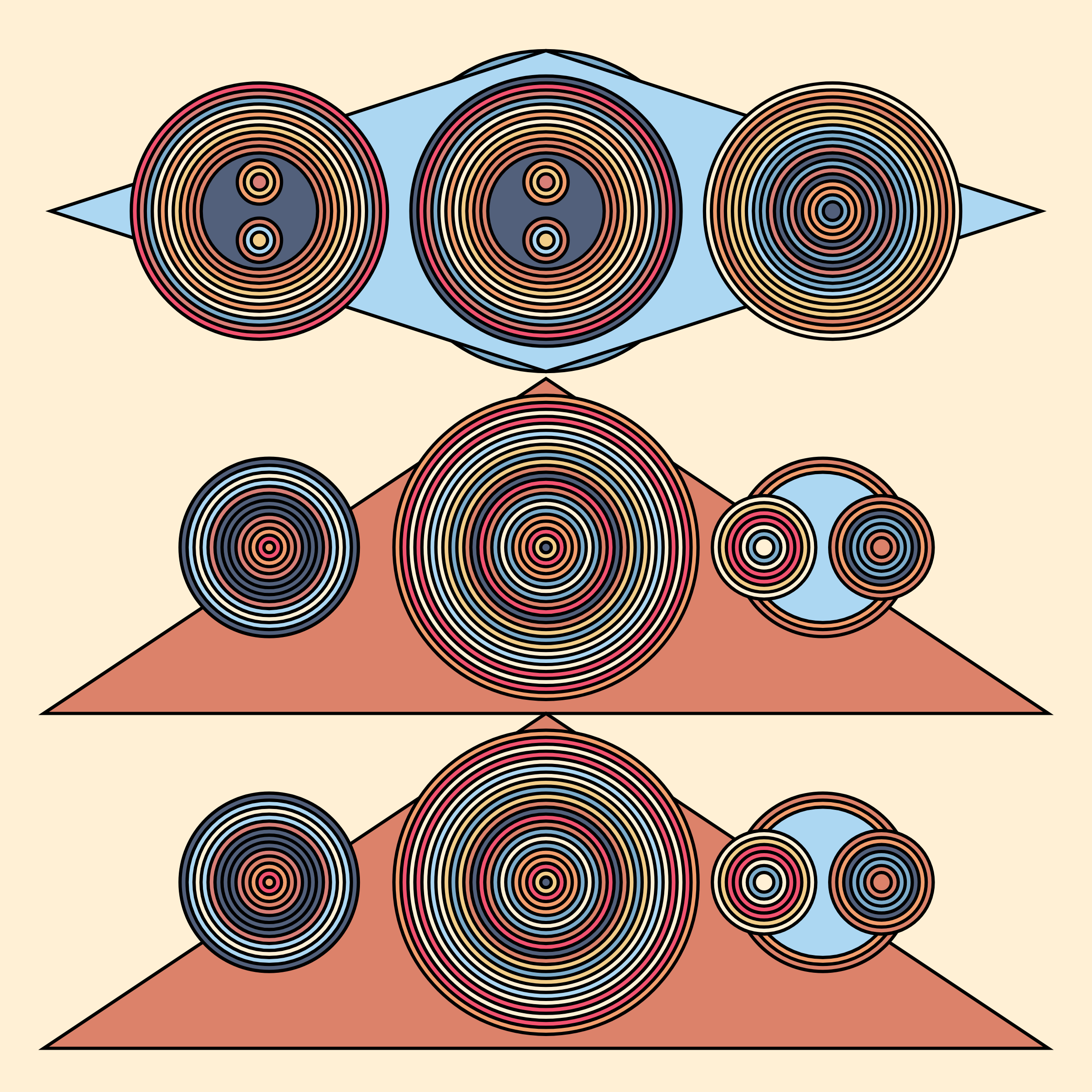 A study in composition using simple shapes and layout rules. When repetitive patterns fail, and the symmetry isn't quite right, the images are strangely evocative. Somewhere between art deco, pop art, and sci-fi.