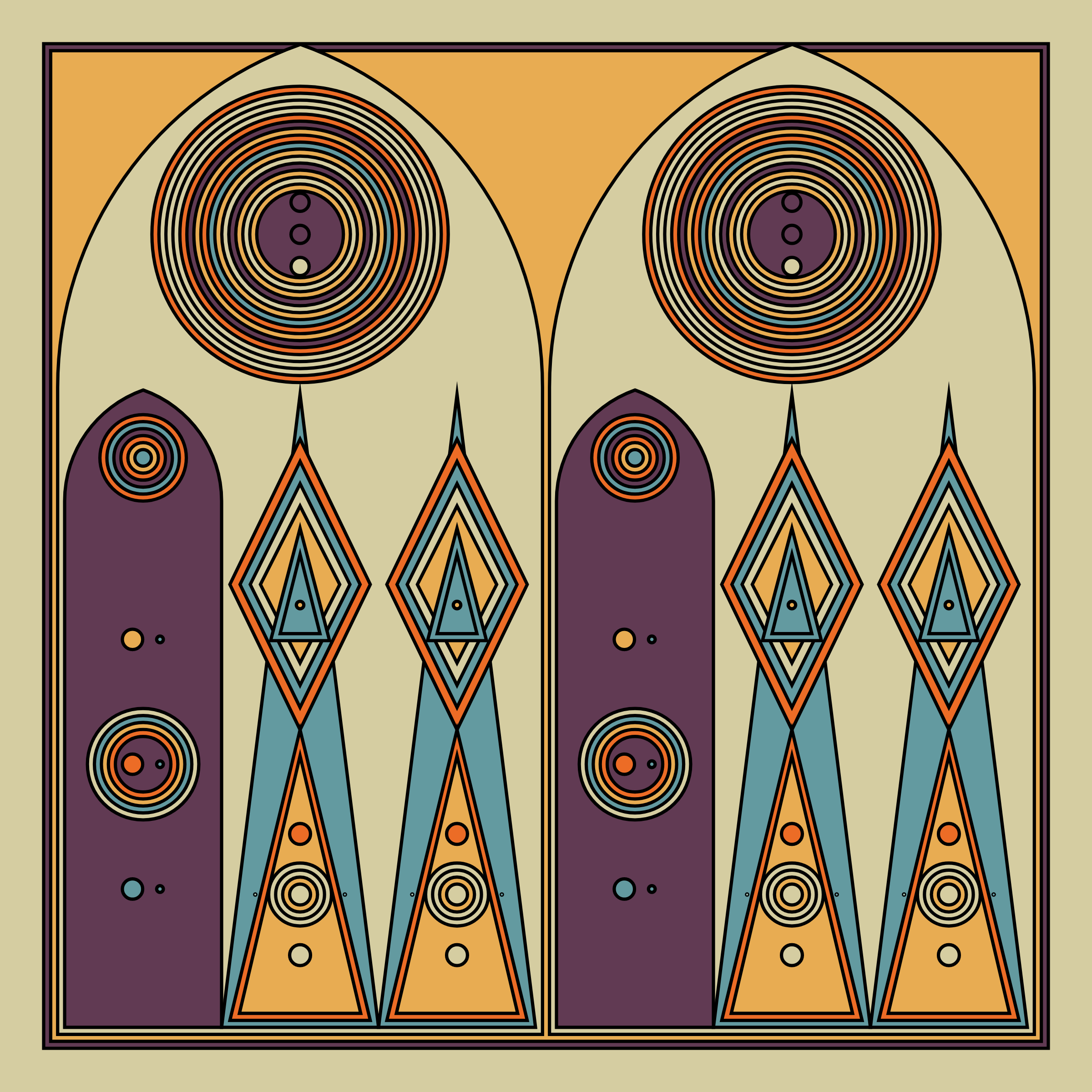 A study in composition using simple shapes and layout rules. When repetitive patterns fail, and the symmetry isn't quite right, the images are strangely evocative. Somewhere between art deco, pop art, and sci-fi.