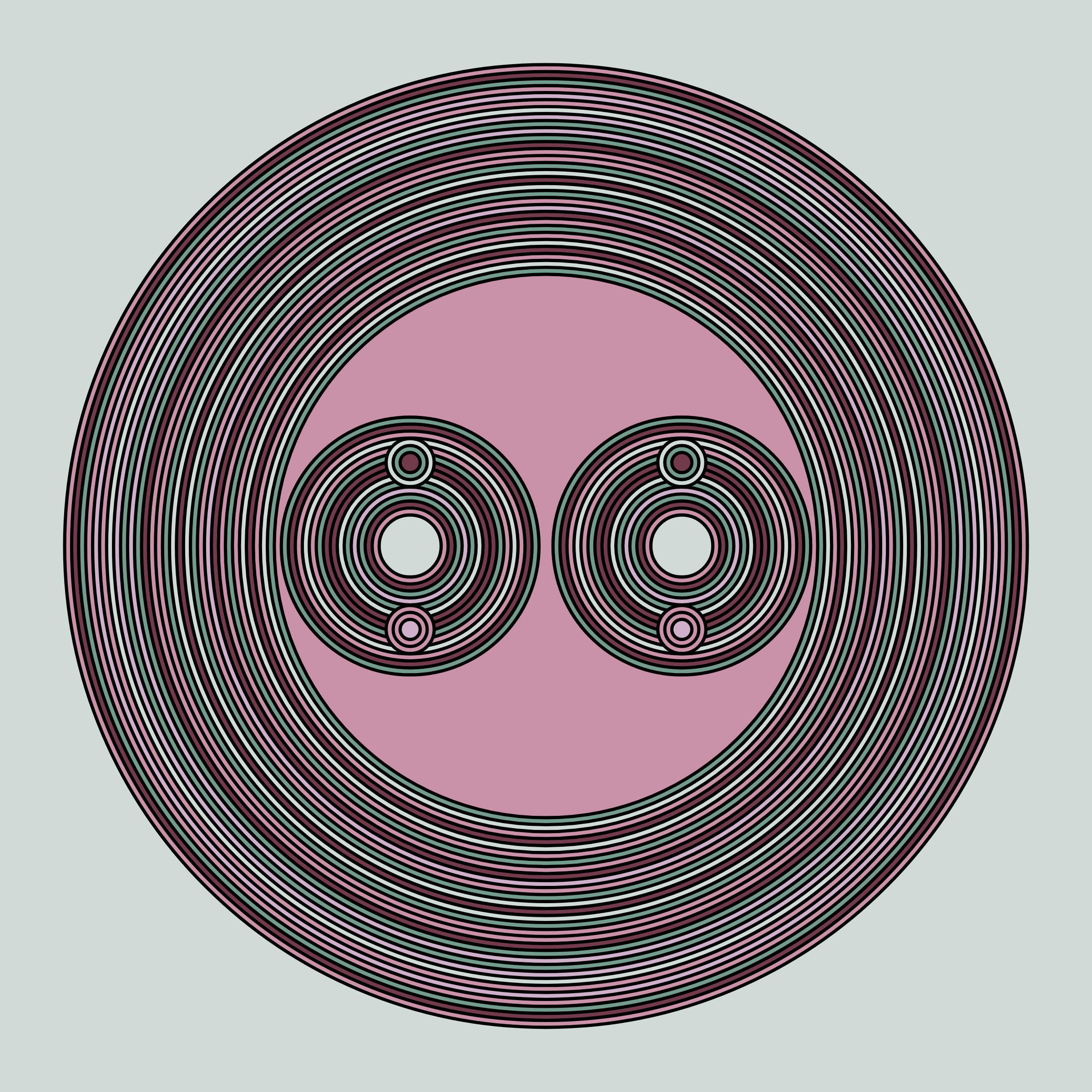 A study in composition using simple shapes and layout rules. When repetitive patterns fail, and the symmetry isn't quite right, the images are strangely evocative. Somewhere between art deco, pop art, and sci-fi.