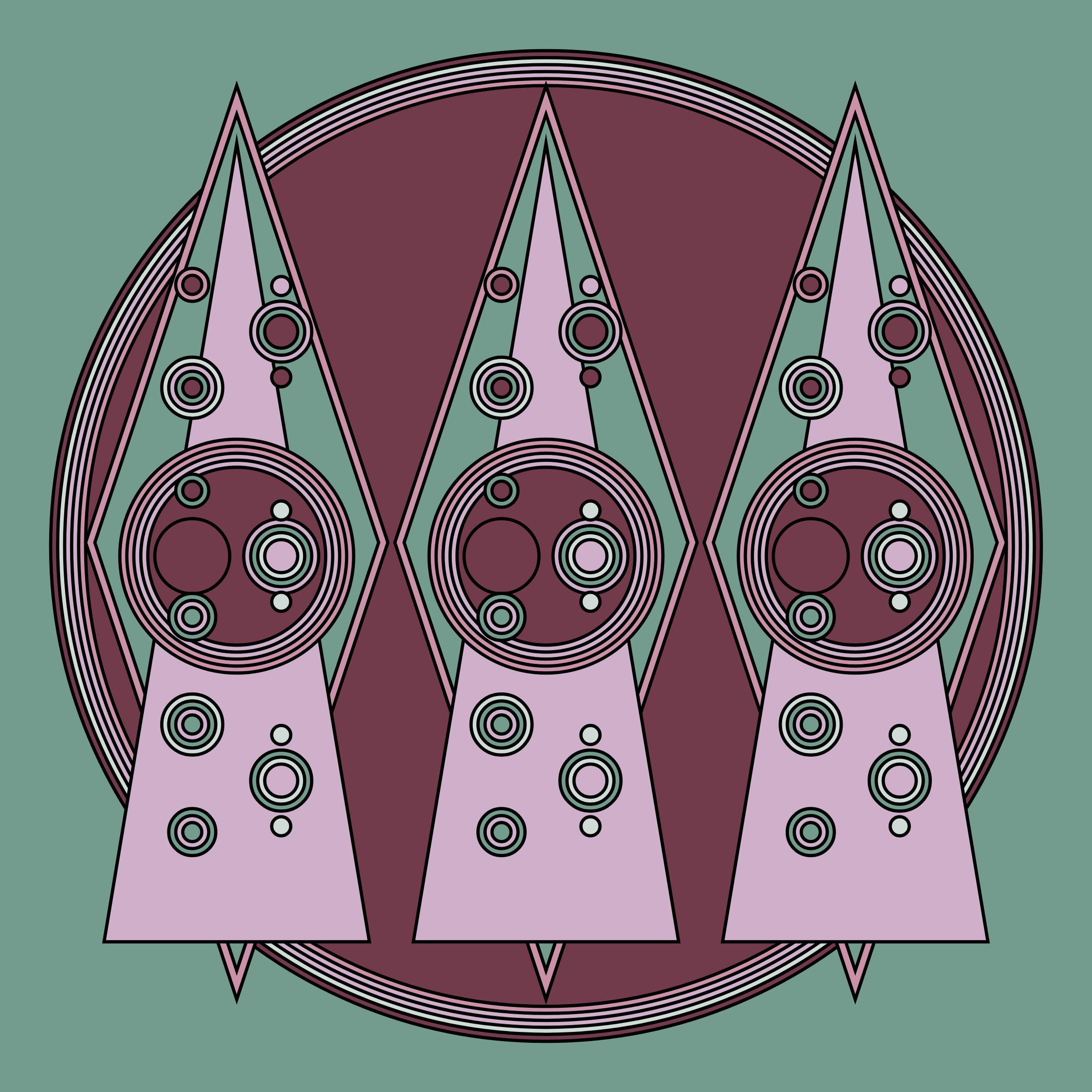 A study in composition using simple shapes and layout rules. When repetitive patterns fail, and the symmetry isn't quite right, the images are strangely evocative. Somewhere between art deco, pop art, and sci-fi.