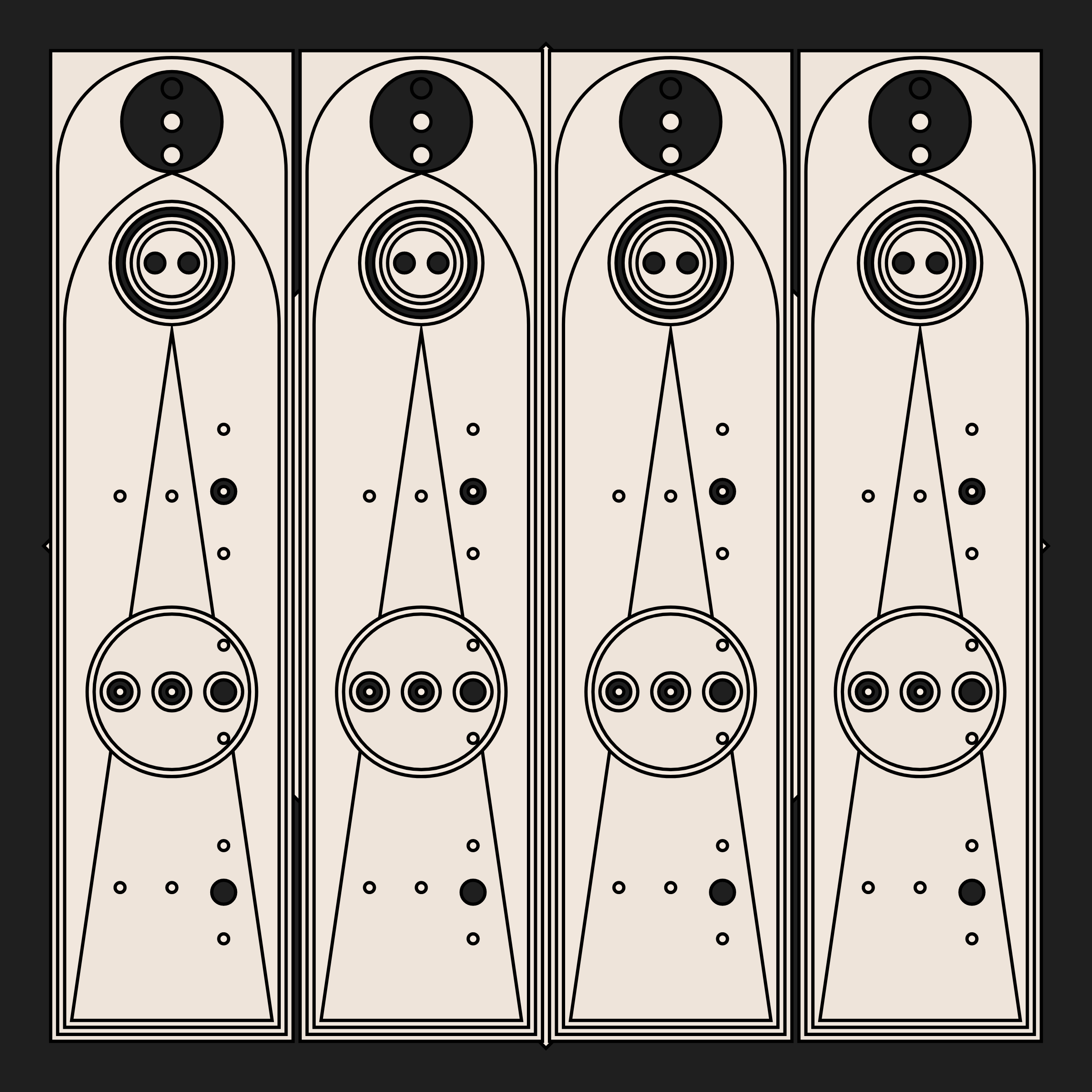 A study in composition using simple shapes and layout rules. When repetitive patterns fail, and the symmetry isn't quite right, the images are strangely evocative. Somewhere between art deco, pop art, and sci-fi.