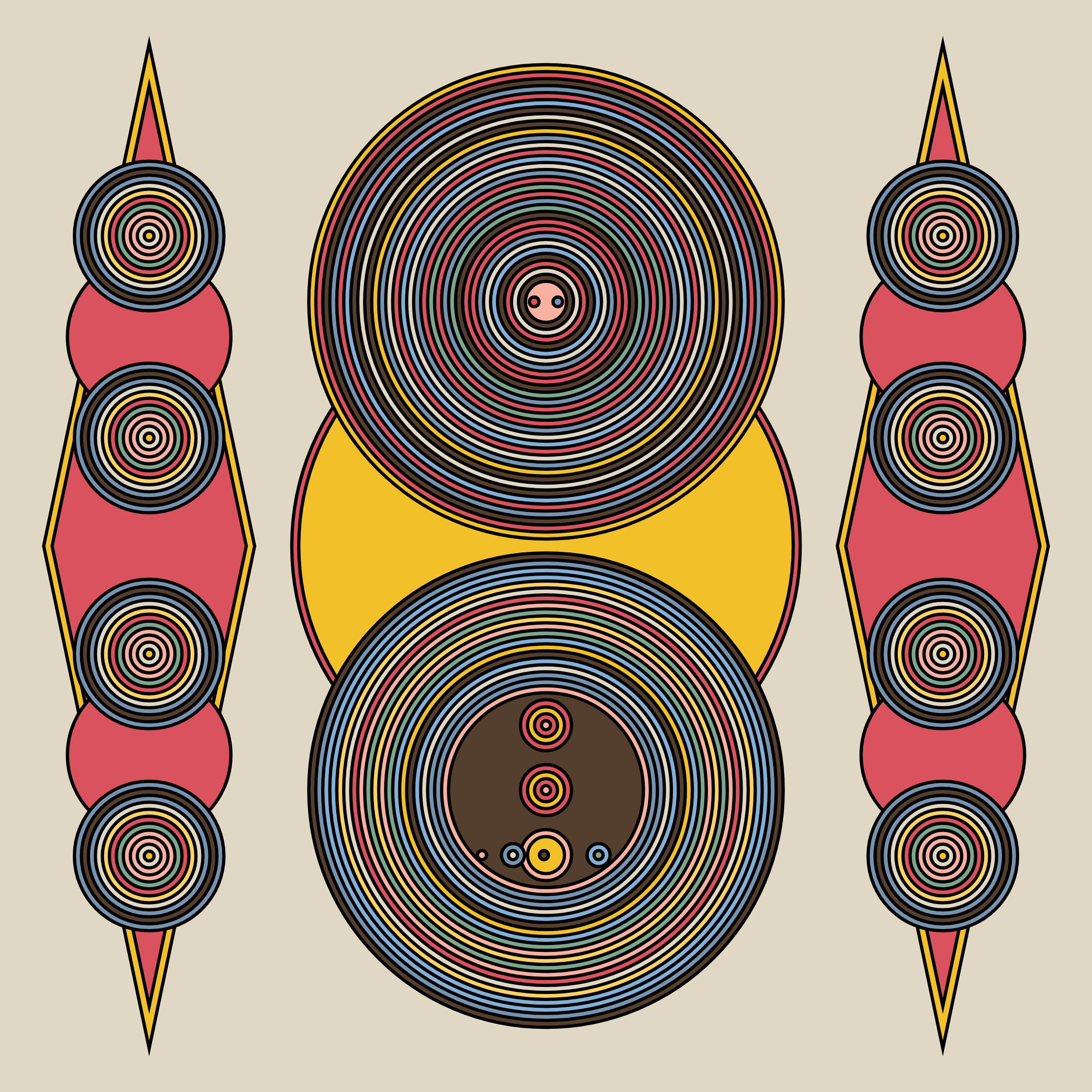 A study in composition using simple shapes and layout rules. When repetitive patterns fail, and the symmetry isn't quite right, the images are strangely evocative. Somewhere between art deco, pop art, and sci-fi.