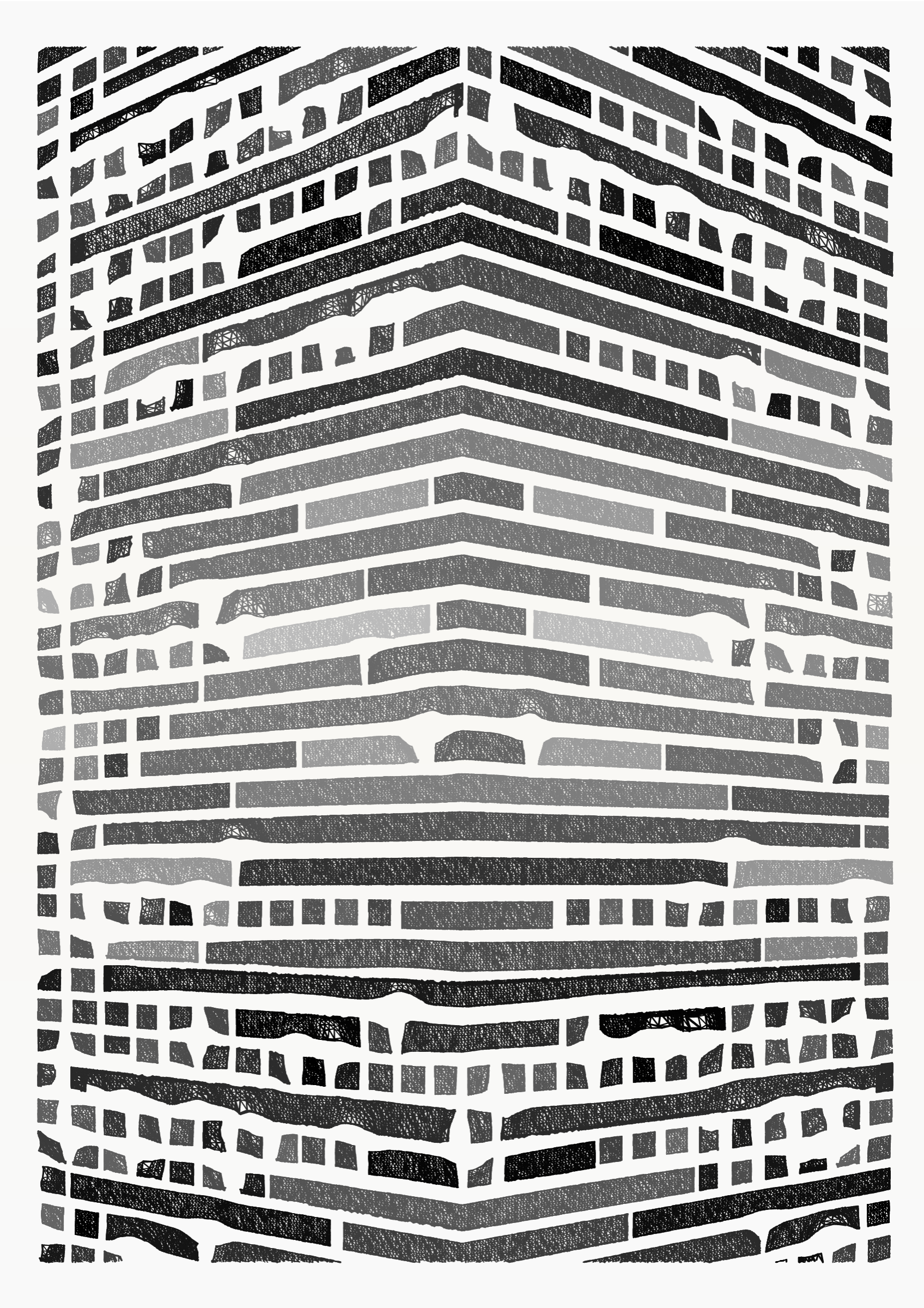 "Edifice" is a series of 976 massive, deteriorating structures built on strange terrain. It is an exploration of buildings being conceptualized, constructed, and eroded away under a wide variety of conditions. Edifice's outputs run the gamut between minimal and maximal, with some showing few large, static blocks of color, and others many small, highly textured and warped shapes. Each image is progressively constructed in front of the viewer's eyes. It is a system full of surprises that I'm excited to share with the world.