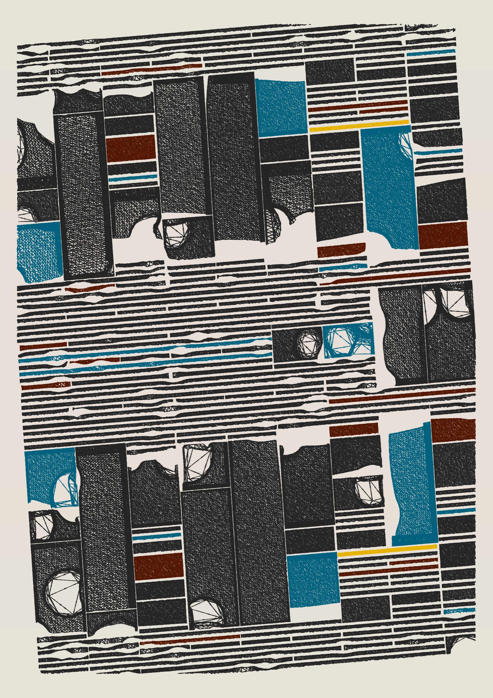 "Edifice" is a series of 976 massive, deteriorating structures built on strange terrain. It is an exploration of buildings being conceptualized, constructed, and eroded away under a wide variety of conditions. Edifice's outputs run the gamut between minimal and maximal, with some showing few large, static blocks of color, and others many small, highly textured and warped shapes. Each image is progressively constructed in front of the viewer's eyes. It is a system full of surprises that I'm excited to share with the world.