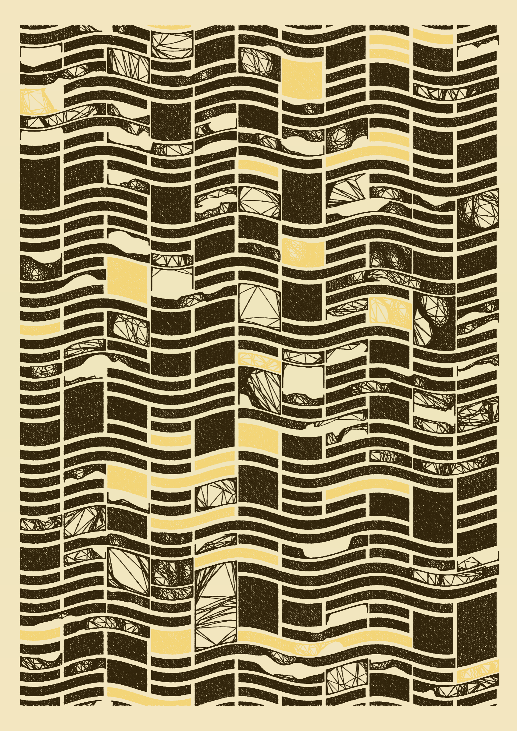 "Edifice" is a series of 976 massive, deteriorating structures built on strange terrain. It is an exploration of buildings being conceptualized, constructed, and eroded away under a wide variety of conditions. Edifice's outputs run the gamut between minimal and maximal, with some showing few large, static blocks of color, and others many small, highly textured and warped shapes. Each image is progressively constructed in front of the viewer's eyes. It is a system full of surprises that I'm excited to share with the world.