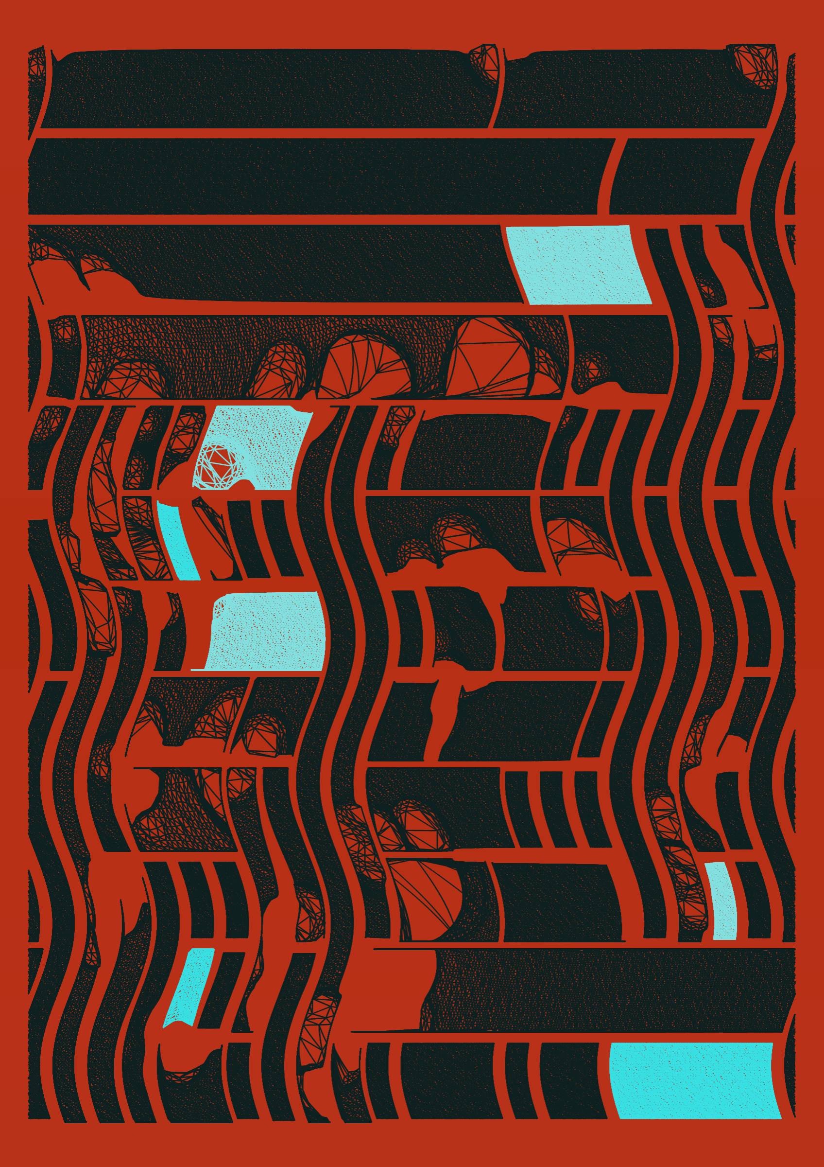 "Edifice" is a series of 976 massive, deteriorating structures built on strange terrain. It is an exploration of buildings being conceptualized, constructed, and eroded away under a wide variety of conditions. Edifice's outputs run the gamut between minimal and maximal, with some showing few large, static blocks of color, and others many small, highly textured and warped shapes. Each image is progressively constructed in front of the viewer's eyes. It is a system full of surprises that I'm excited to share with the world.