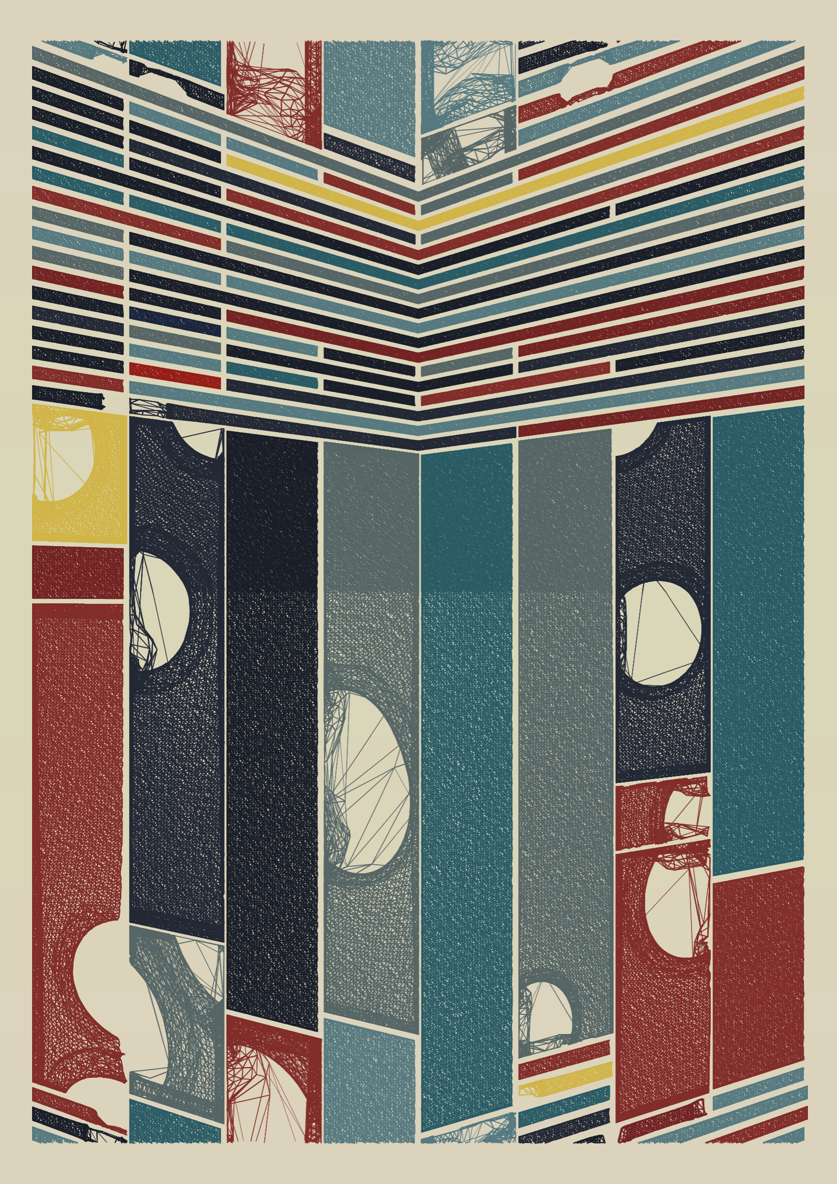 "Edifice" is a series of 976 massive, deteriorating structures built on strange terrain. It is an exploration of buildings being conceptualized, constructed, and eroded away under a wide variety of conditions. Edifice's outputs run the gamut between minimal and maximal, with some showing few large, static blocks of color, and others many small, highly textured and warped shapes. Each image is progressively constructed in front of the viewer's eyes. It is a system full of surprises that I'm excited to share with the world.