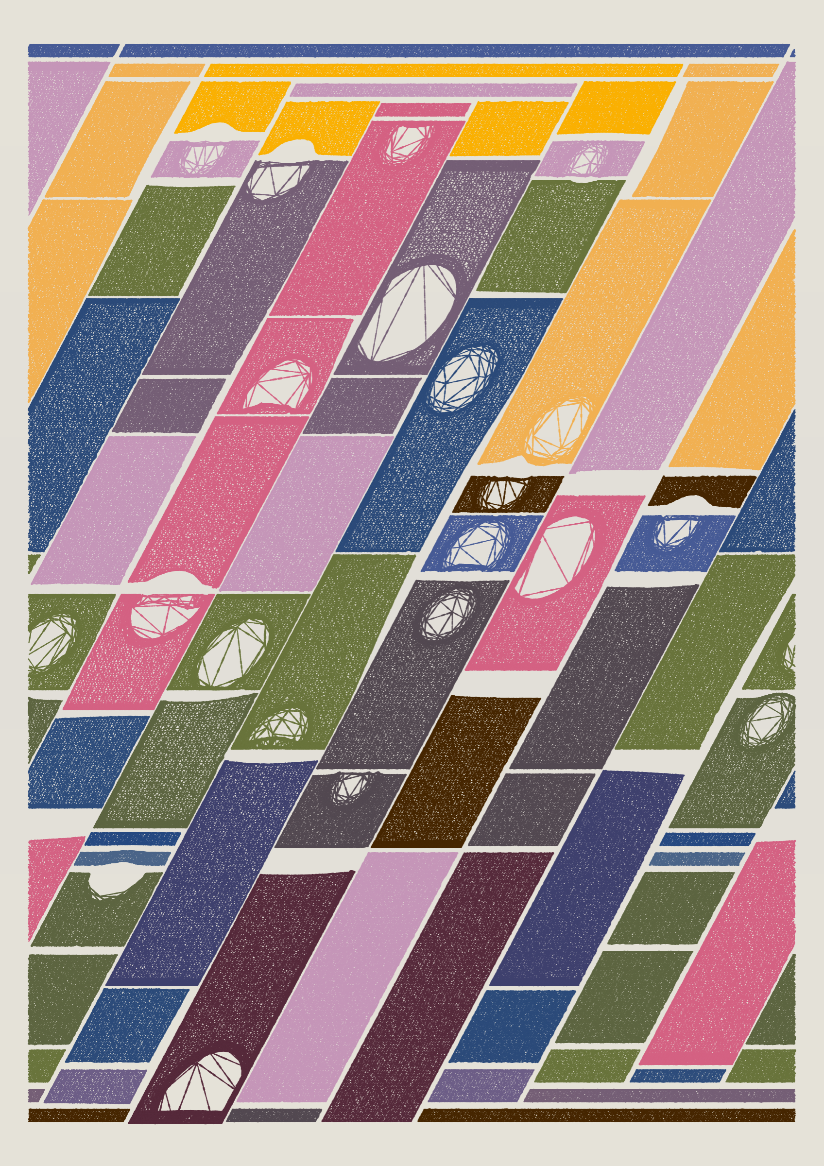 "Edifice" is a series of 976 massive, deteriorating structures built on strange terrain. It is an exploration of buildings being conceptualized, constructed, and eroded away under a wide variety of conditions. Edifice's outputs run the gamut between minimal and maximal, with some showing few large, static blocks of color, and others many small, highly textured and warped shapes. Each image is progressively constructed in front of the viewer's eyes. It is a system full of surprises that I'm excited to share with the world.