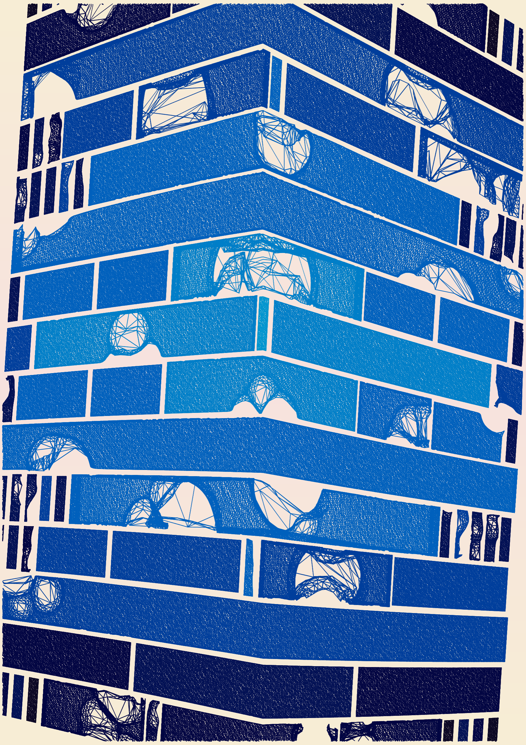 "Edifice" is a series of 976 massive, deteriorating structures built on strange terrain. It is an exploration of buildings being conceptualized, constructed, and eroded away under a wide variety of conditions. Edifice's outputs run the gamut between minimal and maximal, with some showing few large, static blocks of color, and others many small, highly textured and warped shapes. Each image is progressively constructed in front of the viewer's eyes. It is a system full of surprises that I'm excited to share with the world.