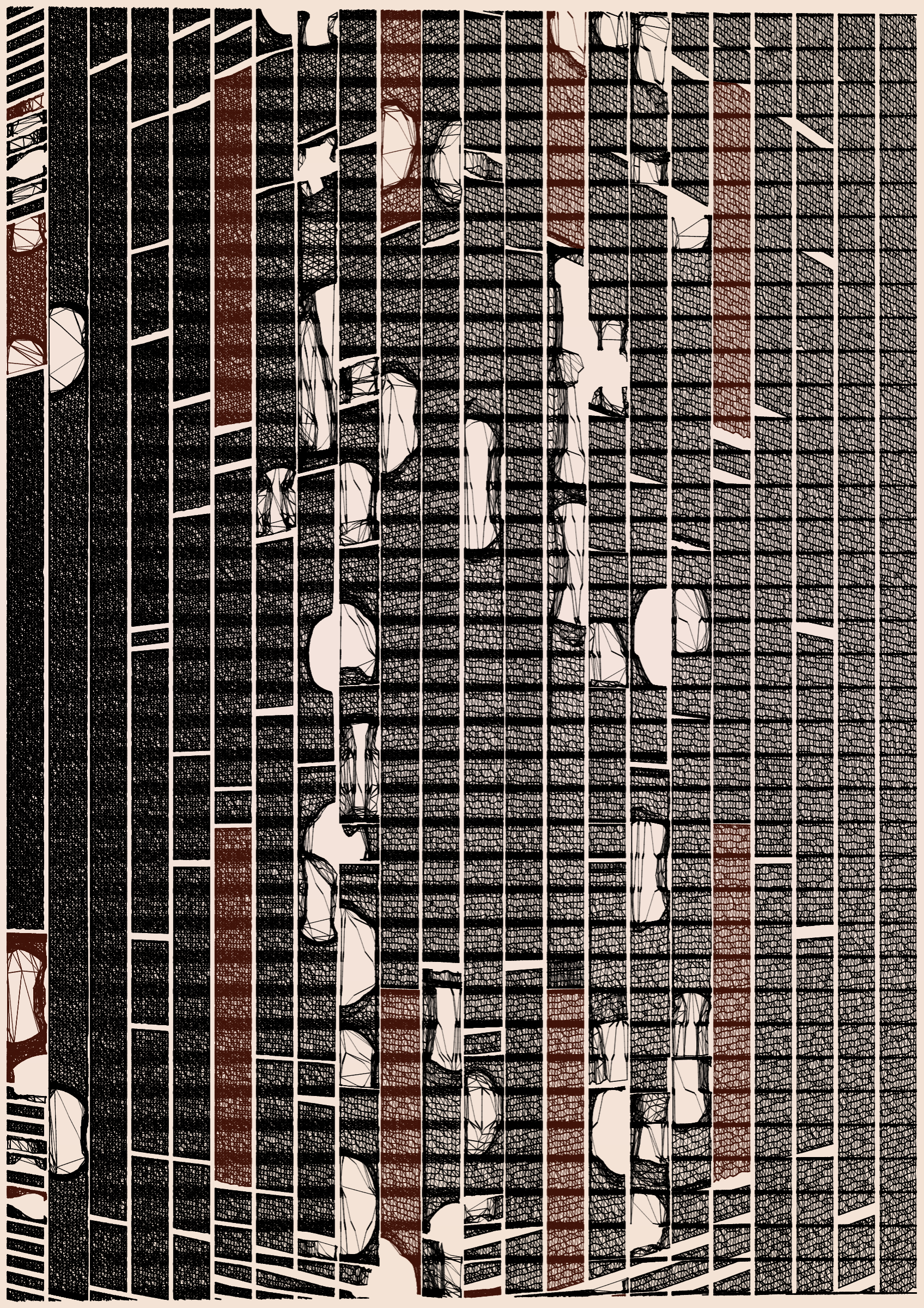 "Edifice" is a series of 976 massive, deteriorating structures built on strange terrain. It is an exploration of buildings being conceptualized, constructed, and eroded away under a wide variety of conditions. Edifice's outputs run the gamut between minimal and maximal, with some showing few large, static blocks of color, and others many small, highly textured and warped shapes. Each image is progressively constructed in front of the viewer's eyes. It is a system full of surprises that I'm excited to share with the world.