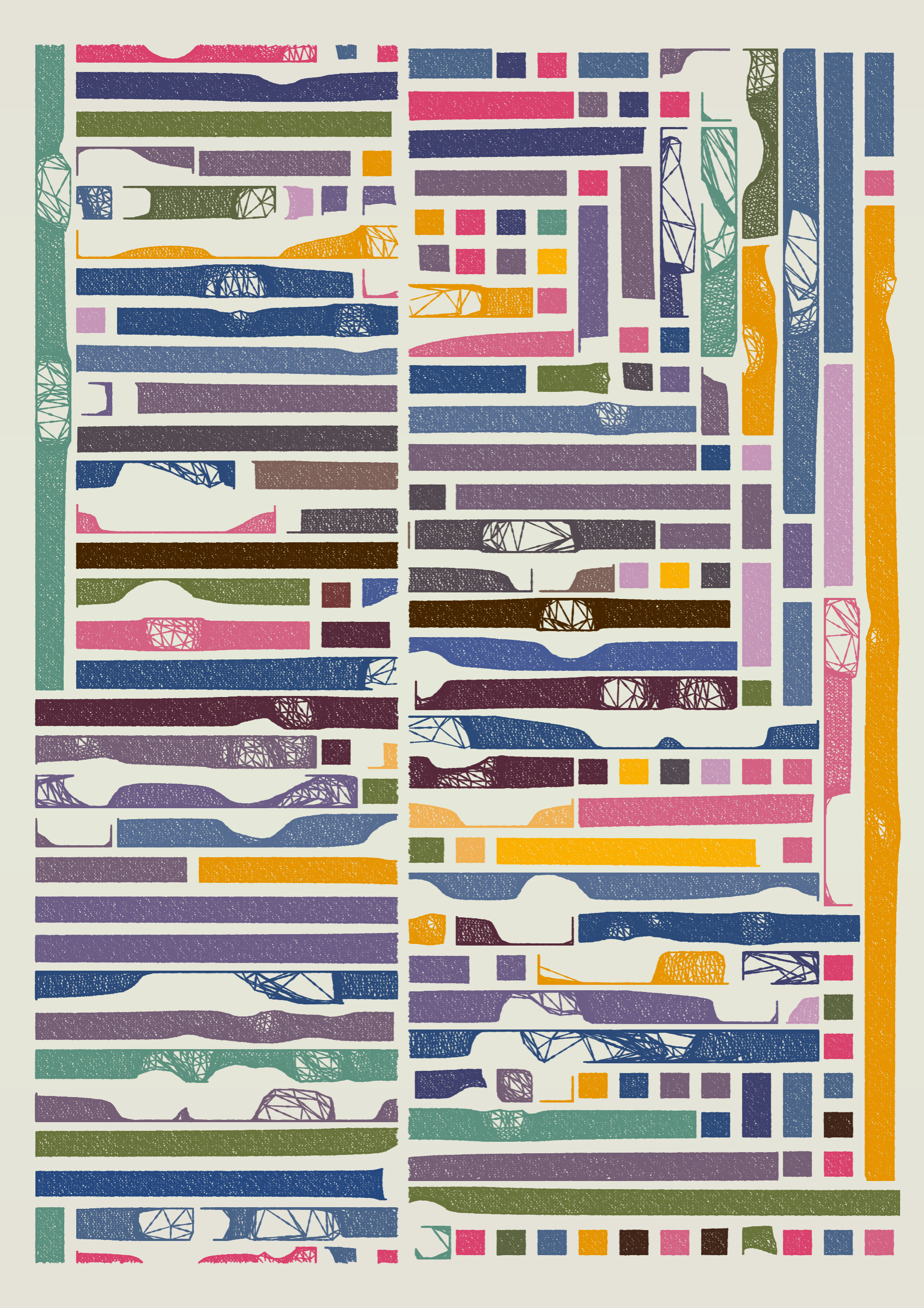 "Edifice" is a series of 976 massive, deteriorating structures built on strange terrain. It is an exploration of buildings being conceptualized, constructed, and eroded away under a wide variety of conditions. Edifice's outputs run the gamut between minimal and maximal, with some showing few large, static blocks of color, and others many small, highly textured and warped shapes. Each image is progressively constructed in front of the viewer's eyes. It is a system full of surprises that I'm excited to share with the world.