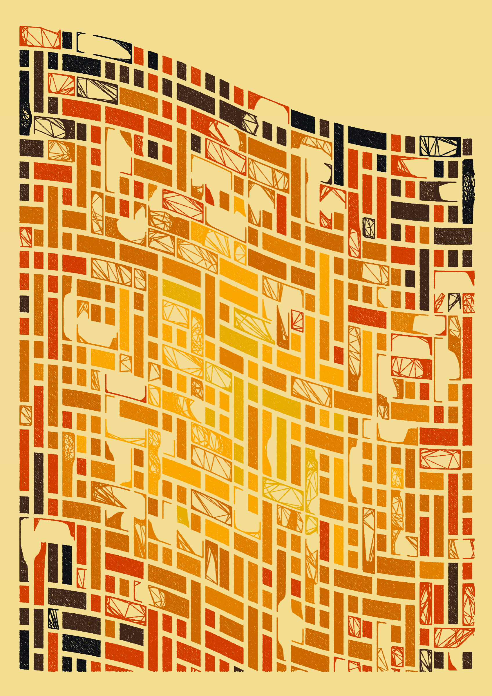 "Edifice" is a series of 976 massive, deteriorating structures built on strange terrain. It is an exploration of buildings being conceptualized, constructed, and eroded away under a wide variety of conditions. Edifice's outputs run the gamut between minimal and maximal, with some showing few large, static blocks of color, and others many small, highly textured and warped shapes. Each image is progressively constructed in front of the viewer's eyes. It is a system full of surprises that I'm excited to share with the world.