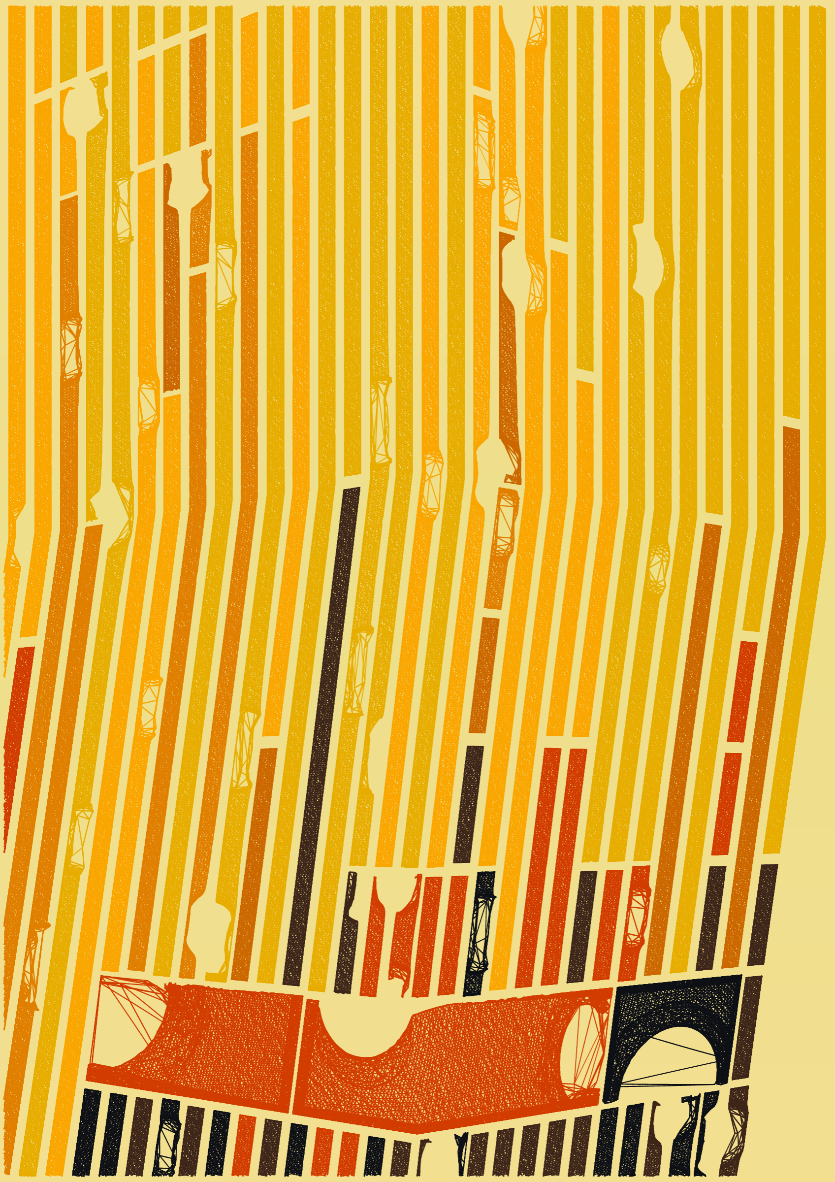 "Edifice" is a series of 976 massive, deteriorating structures built on strange terrain. It is an exploration of buildings being conceptualized, constructed, and eroded away under a wide variety of conditions. Edifice's outputs run the gamut between minimal and maximal, with some showing few large, static blocks of color, and others many small, highly textured and warped shapes. Each image is progressively constructed in front of the viewer's eyes. It is a system full of surprises that I'm excited to share with the world.