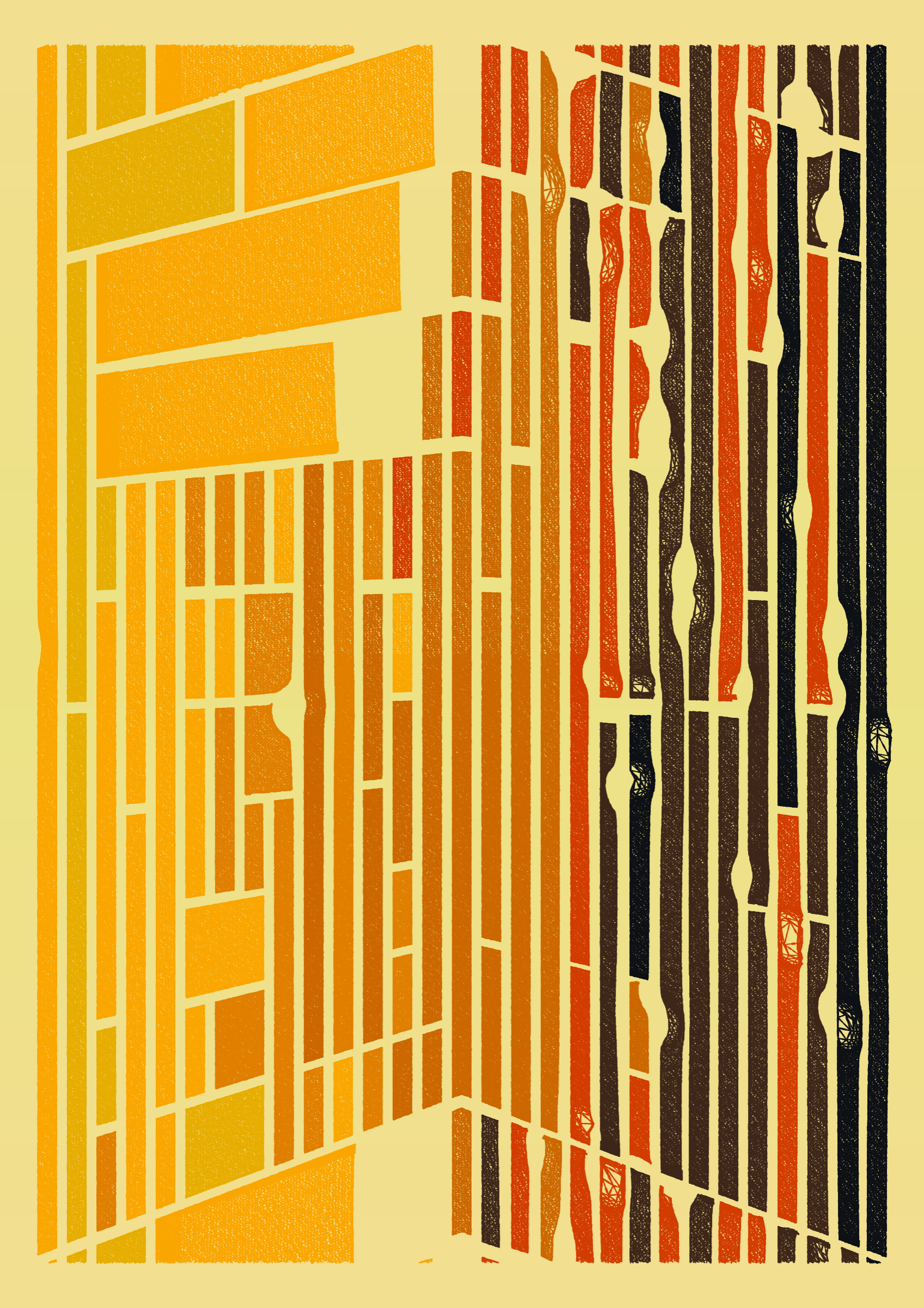 "Edifice" is a series of 976 massive, deteriorating structures built on strange terrain. It is an exploration of buildings being conceptualized, constructed, and eroded away under a wide variety of conditions. Edifice's outputs run the gamut between minimal and maximal, with some showing few large, static blocks of color, and others many small, highly textured and warped shapes. Each image is progressively constructed in front of the viewer's eyes. It is a system full of surprises that I'm excited to share with the world.