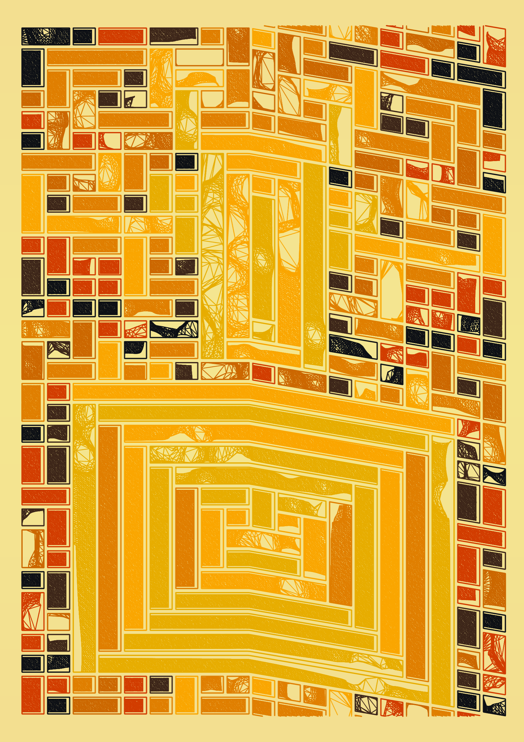 "Edifice" is a series of 976 massive, deteriorating structures built on strange terrain. It is an exploration of buildings being conceptualized, constructed, and eroded away under a wide variety of conditions. Edifice's outputs run the gamut between minimal and maximal, with some showing few large, static blocks of color, and others many small, highly textured and warped shapes. Each image is progressively constructed in front of the viewer's eyes. It is a system full of surprises that I'm excited to share with the world.