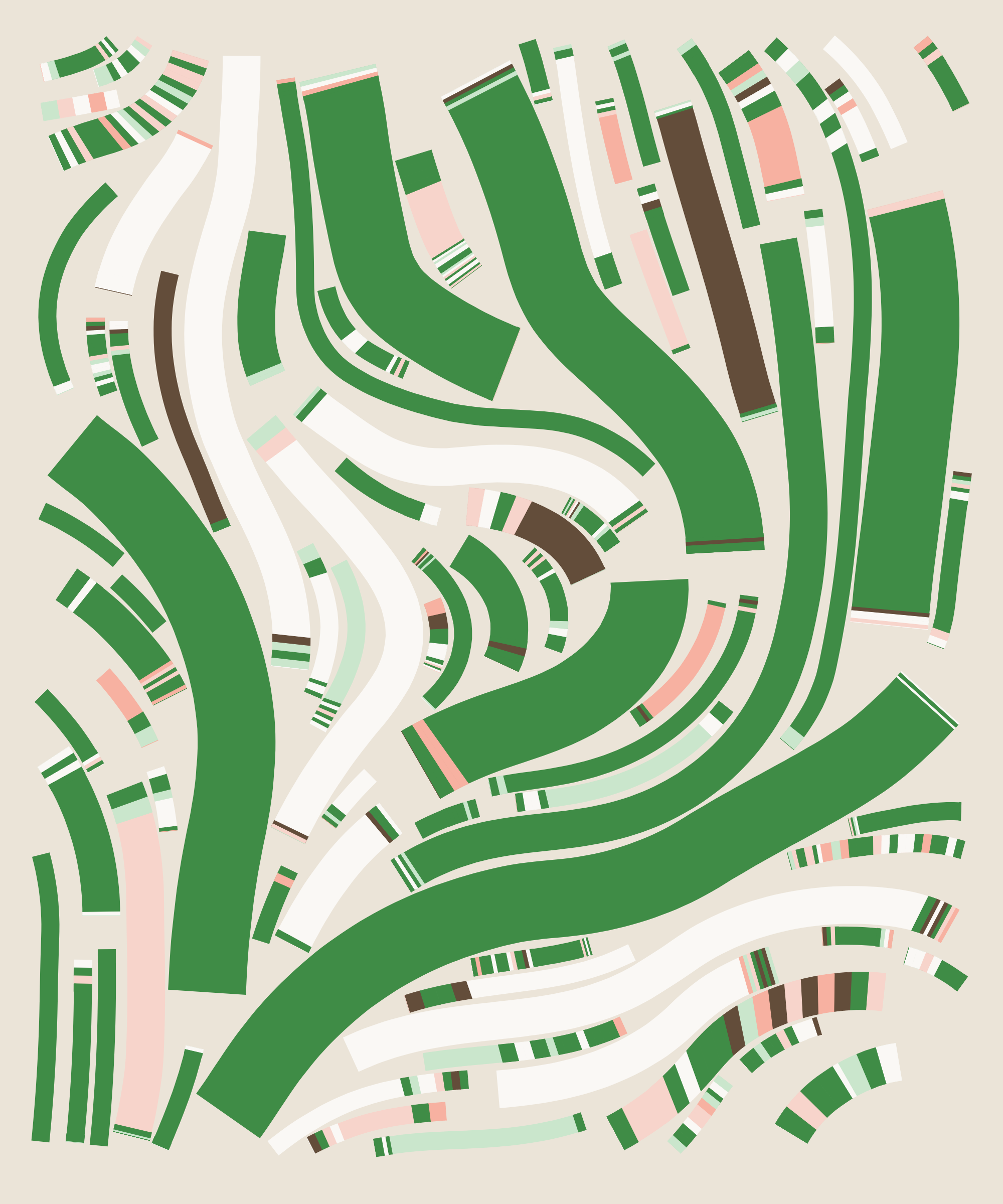 Fidenza is by far my most versatile algorithm to date. Although the program stays focused on structured curves and blocks, the varieties of scale, organization, texture, and color usage it can employ create a wide array of generative possibilities.