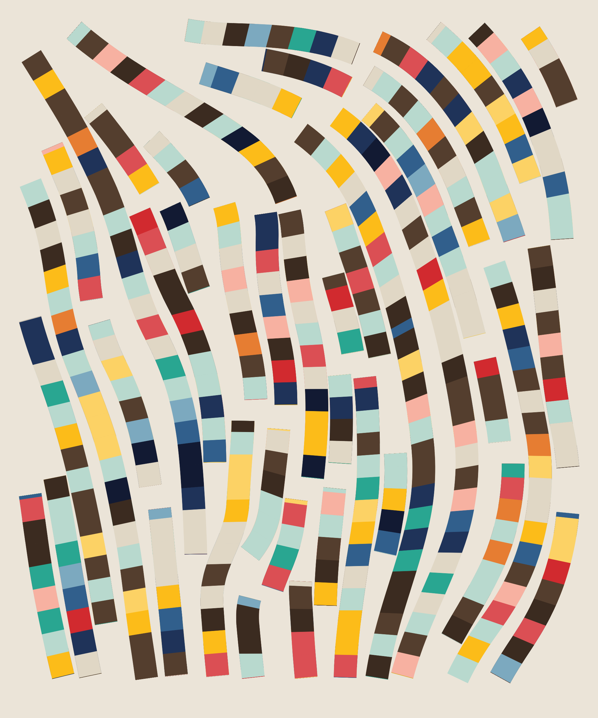 Fidenza is by far my most versatile algorithm to date. Although the program stays focused on structured curves and blocks, the varieties of scale, organization, texture, and color usage it can employ create a wide array of generative possibilities.