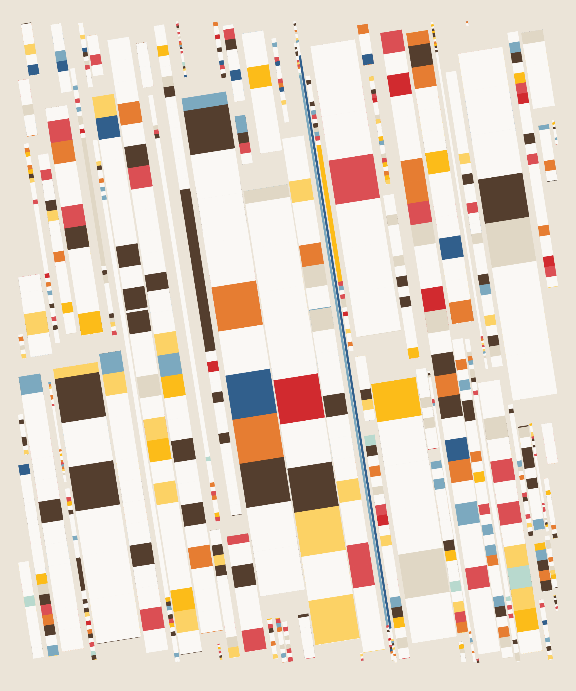 Fidenza is by far my most versatile algorithm to date. Although the program stays focused on structured curves and blocks, the varieties of scale, organization, texture, and color usage it can employ create a wide array of generative possibilities.