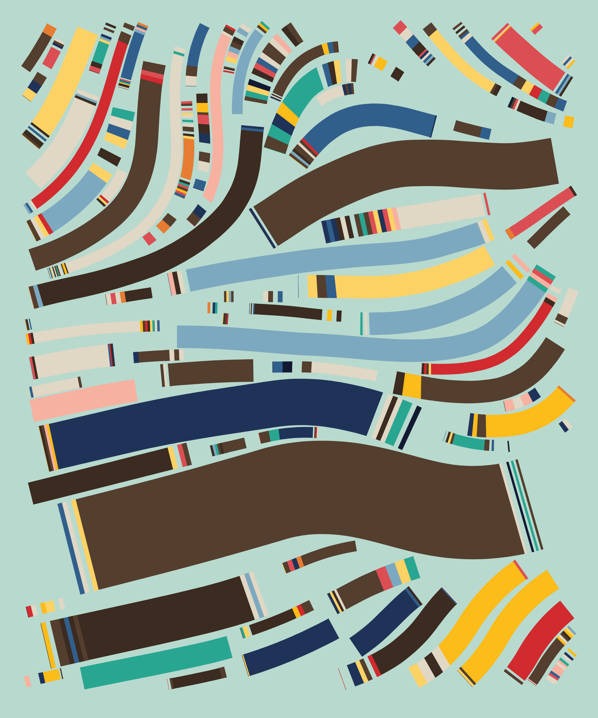 Fidenza is by far my most versatile algorithm to date. Although the program stays focused on structured curves and blocks, the varieties of scale, organization, texture, and color usage it can employ create a wide array of generative possibilities.