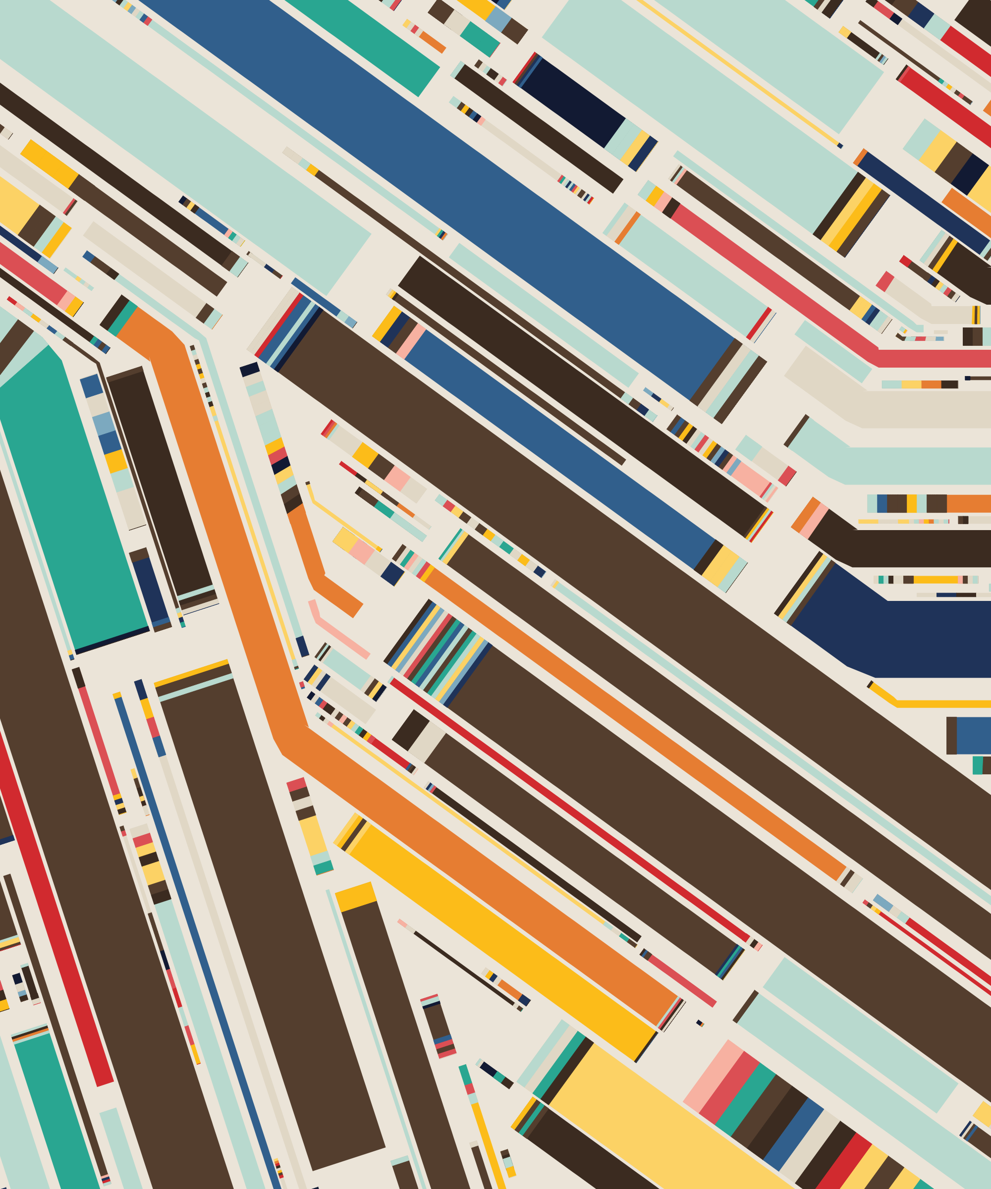 Fidenza is by far my most versatile algorithm to date. Although the program stays focused on structured curves and blocks, the varieties of scale, organization, texture, and color usage it can employ create a wide array of generative possibilities.