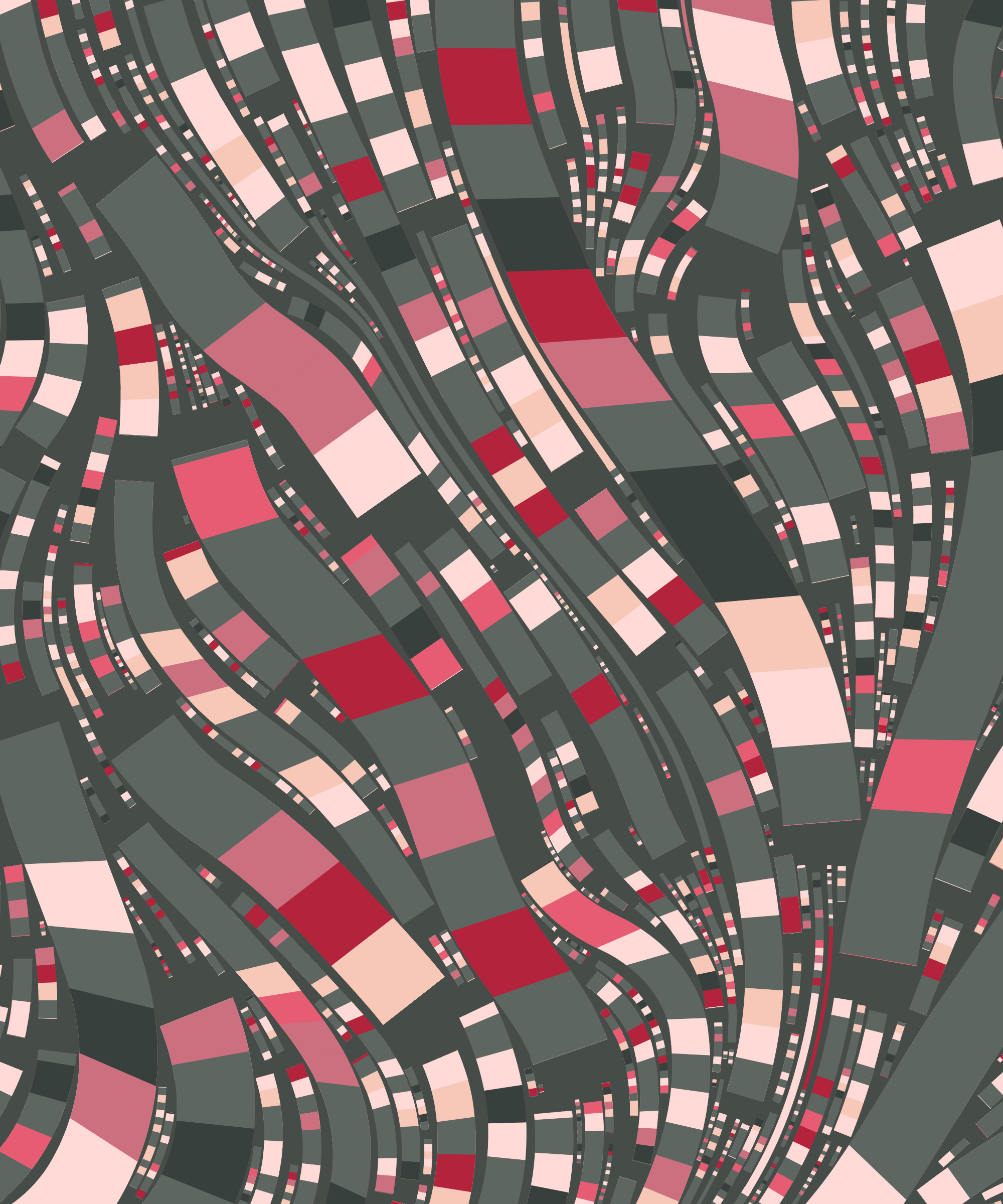 Fidenza is by far my most versatile algorithm to date. Although the program stays focused on structured curves and blocks, the varieties of scale, organization, texture, and color usage it can employ create a wide array of generative possibilities.