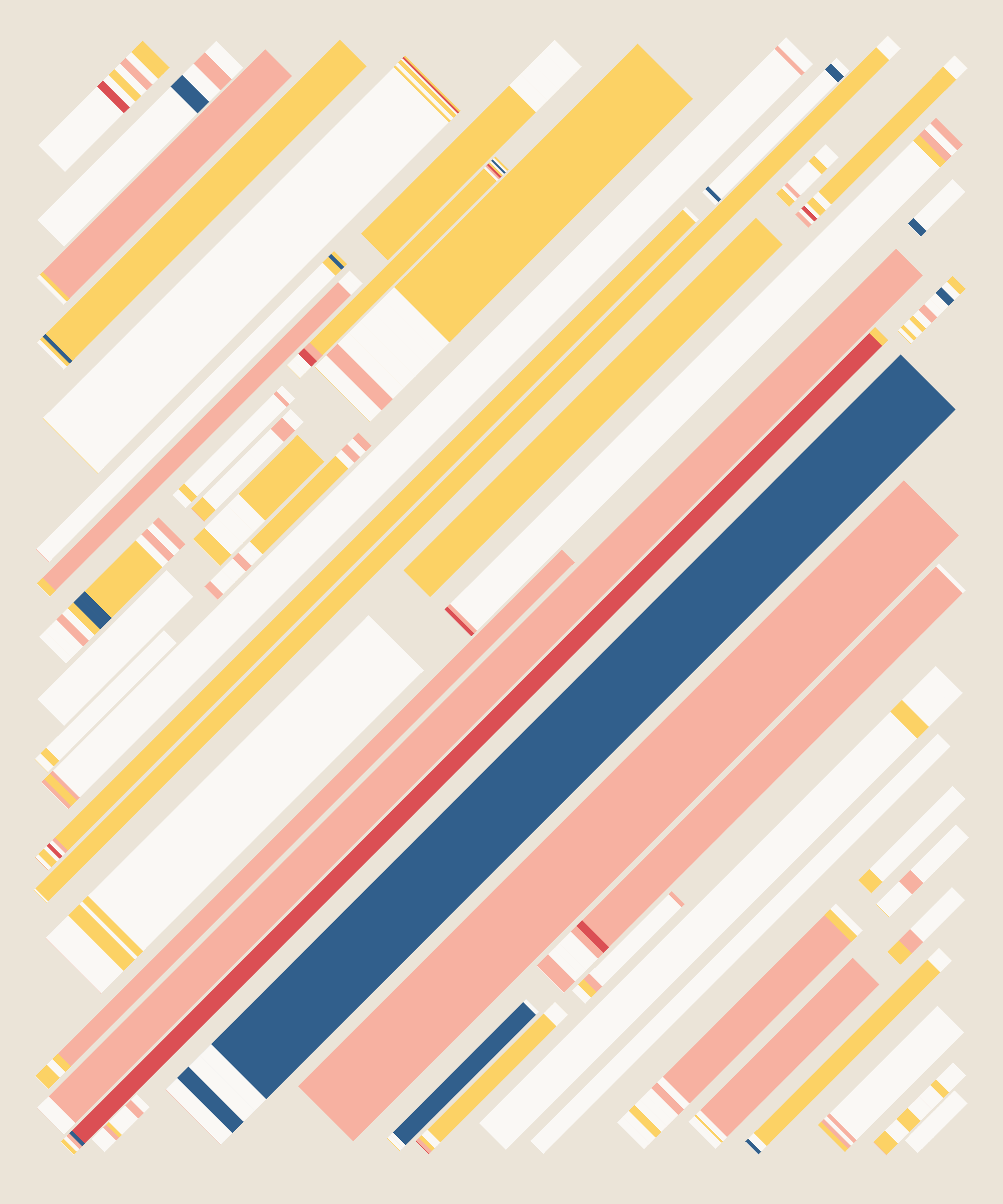 Fidenza is by far my most versatile algorithm to date. Although the program stays focused on structured curves and blocks, the varieties of scale, organization, texture, and color usage it can employ create a wide array of generative possibilities.
