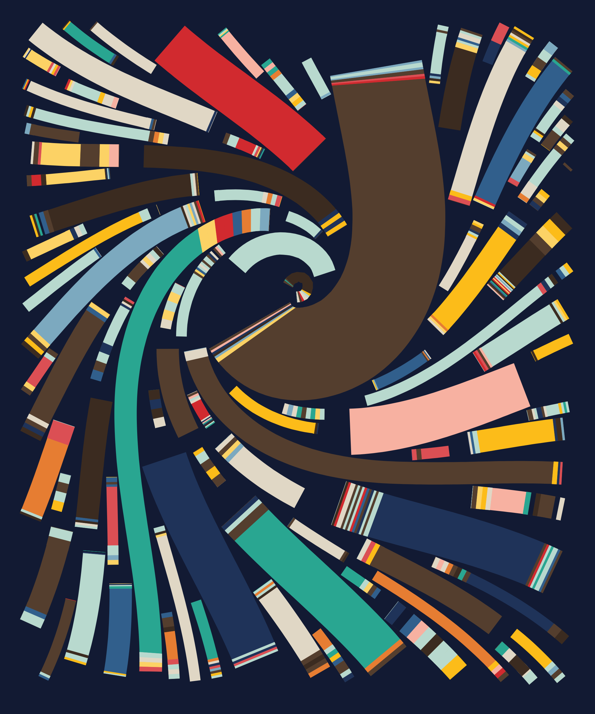 Fidenza is by far my most versatile algorithm to date. Although the program stays focused on structured curves and blocks, the varieties of scale, organization, texture, and color usage it can employ create a wide array of generative possibilities.