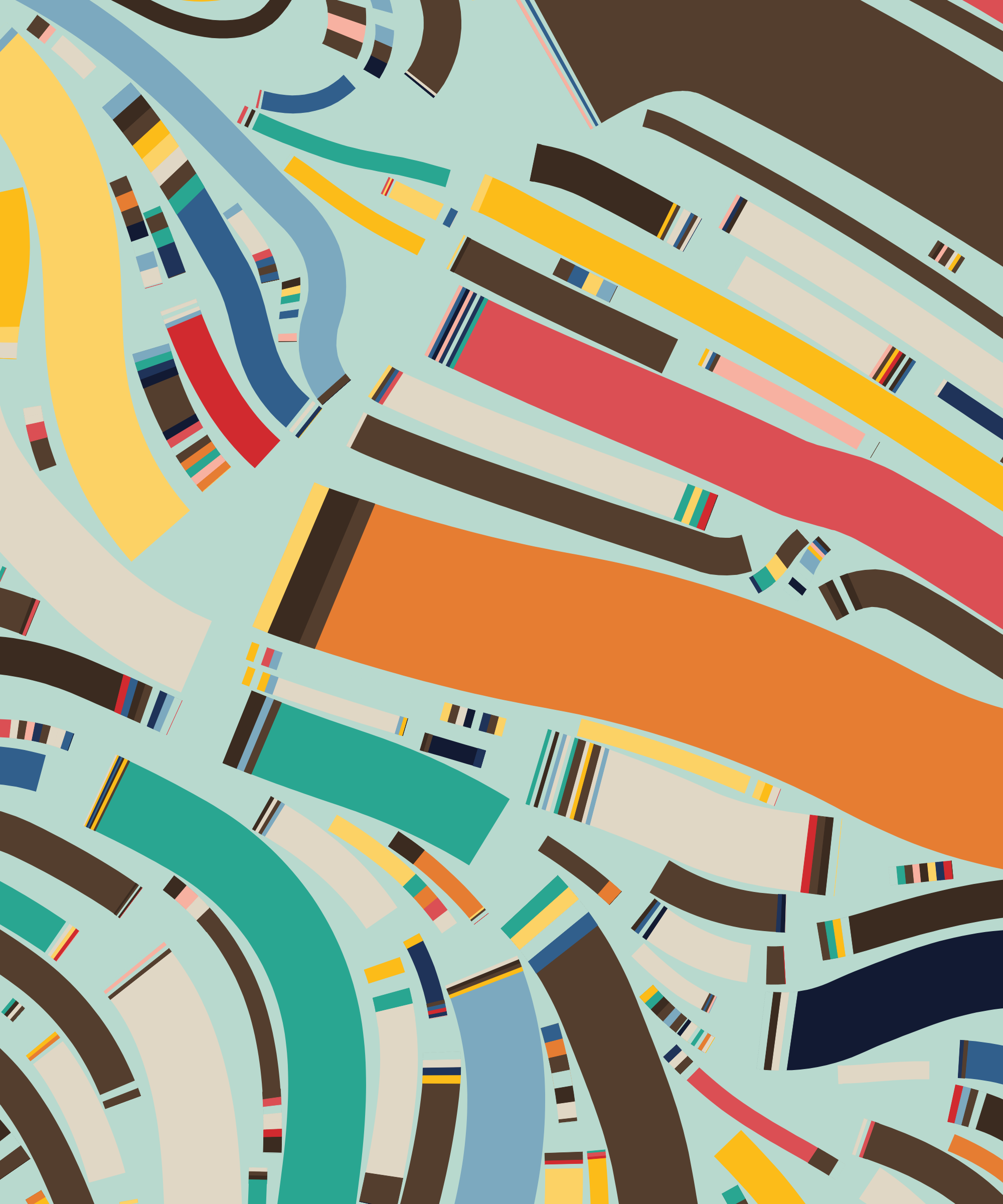 Fidenza is by far my most versatile algorithm to date. Although the program stays focused on structured curves and blocks, the varieties of scale, organization, texture, and color usage it can employ create a wide array of generative possibilities.