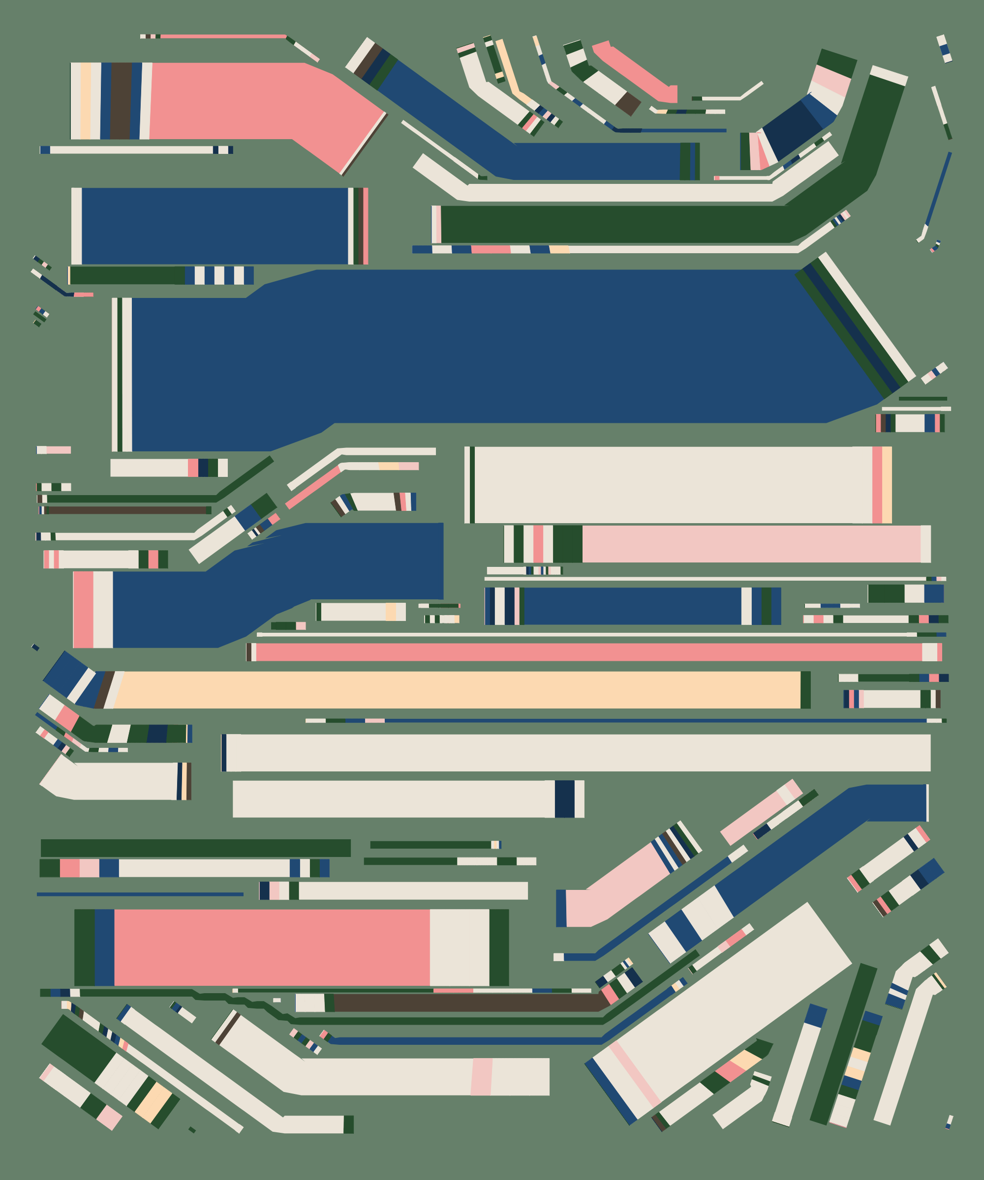 Fidenza is by far my most versatile algorithm to date. Although the program stays focused on structured curves and blocks, the varieties of scale, organization, texture, and color usage it can employ create a wide array of generative possibilities.